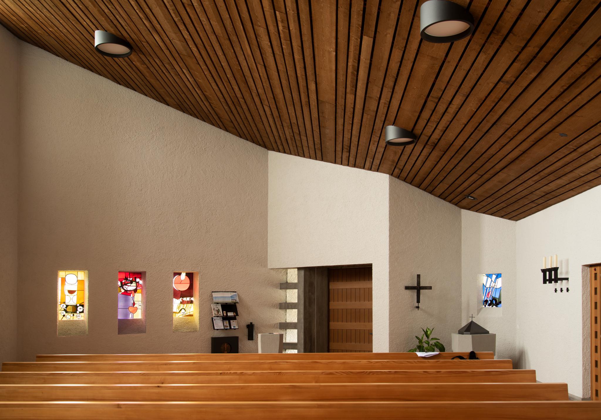 1963 erbaut von Ernest Brantschen und Alfons Weisser. Kirchenschiff als weiss verputzter mit Eternitschiefer gedeckter Pultdachbau auf einem Grundriss in der Form eines unregelmässigen Sechsecks. Im Süden Glockenturm. Über dem Eingang ein Relieffries in Sichtbeton. Glasfenster von Walter Burger. 2017/18 Gesamtrestaurierung.