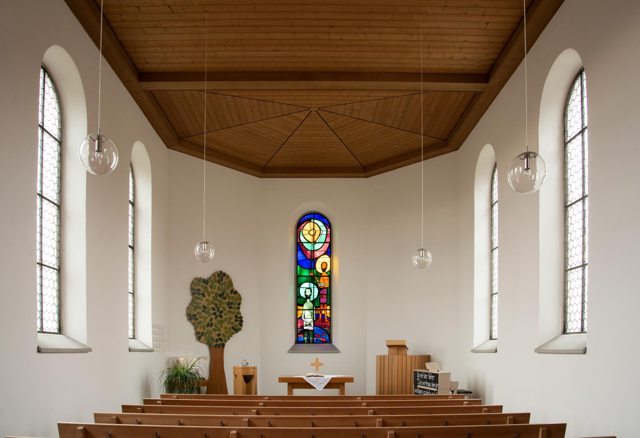 Erwähnt 1312; 1512 umgebaut. Neubau 1863–64 durch Baumeister Raggenbass und Joachim Wellauer. 1969–70 tiefgreifende Neugestaltung durch Peter Hartung. Chorfenster von Hans Affeltranger 1970.