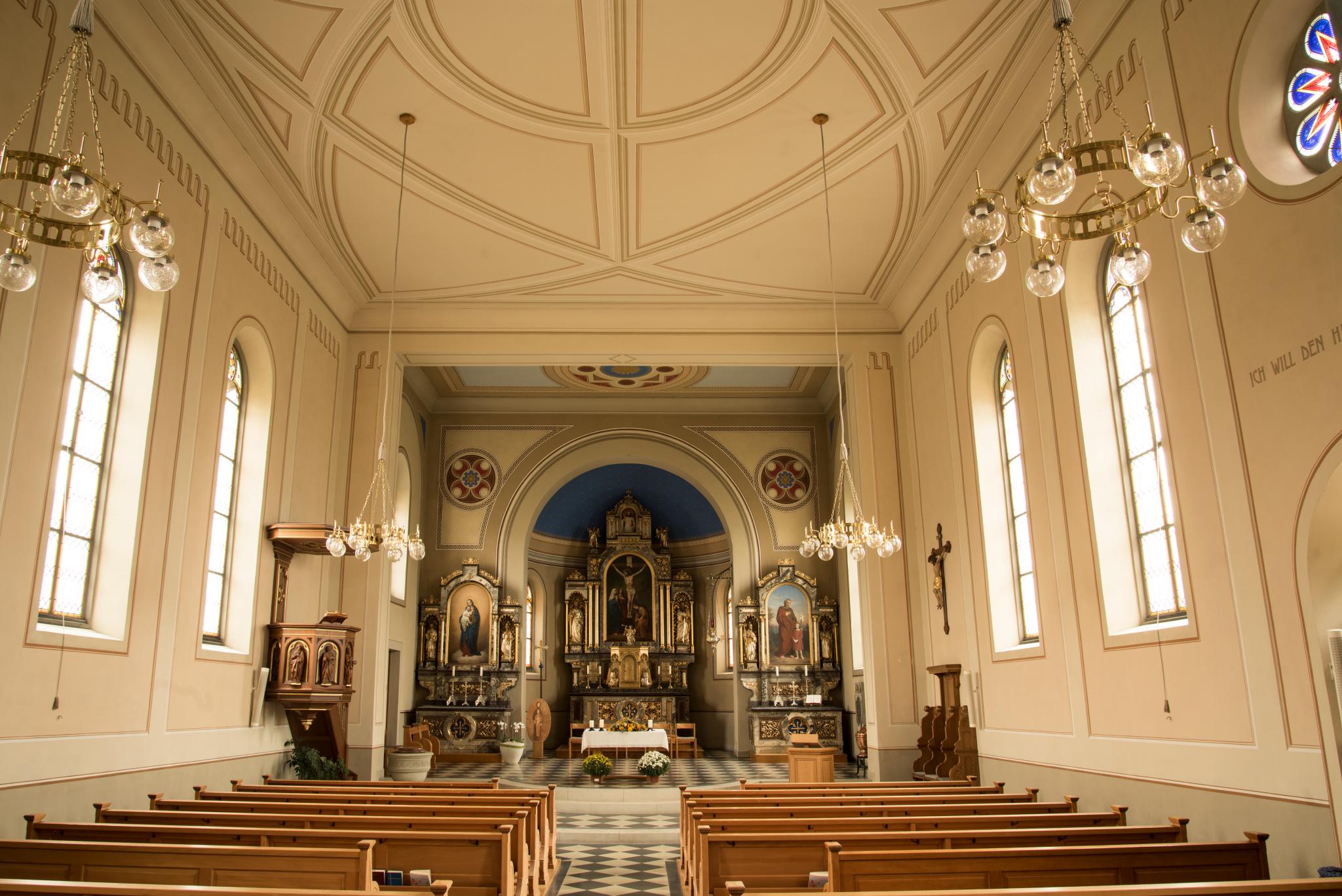 Für die neu erbaute Kirche schuf Johann Jakob Röttinger insgesamt sechzehn Glasmalereien: zwei Rundfenster über den Seiteneingängen und vierzehn Rundbogenfenster in Schiff und Chor. Letztere tragen ein Medaillon im Bogenfeld und sind hauptsächlich ornamental gestaltet. Einzig die Medaillons der beiden Chorfenster zeigen Brustbilder von Heiligen (TG_920, TG_921).