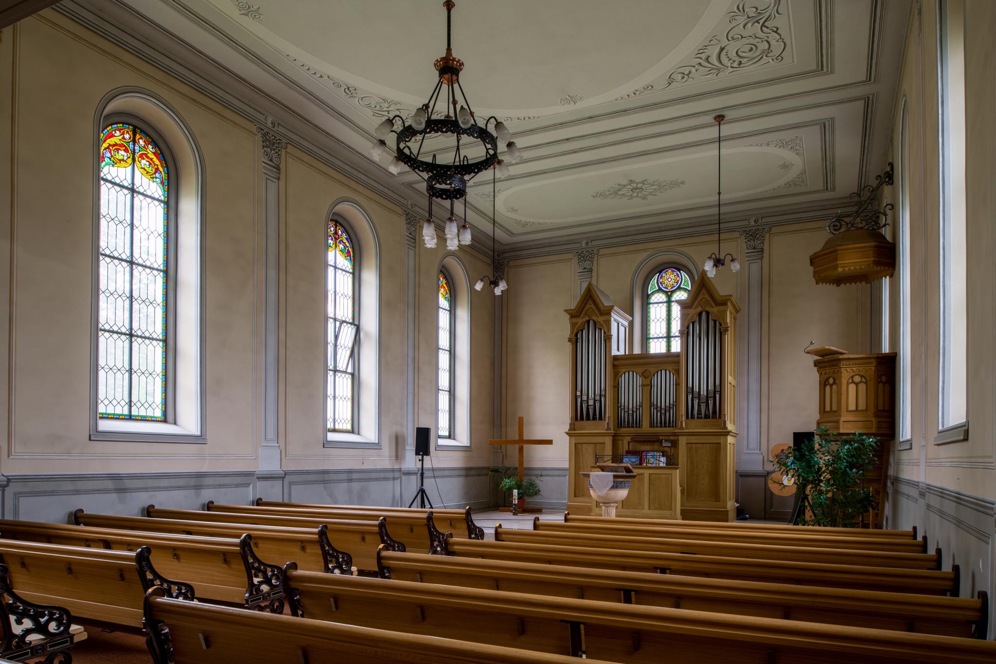 Historisch gut dokumentiertes Gotteshaus (seit 1275), ursprünglich St. Afra und St. Nikolaus geweiht. Spätgotische Kirchenanlage. Die Seitenwände des Kirchenschiffs stammen wohl noch aus spätgotischer Zeit, der ehemalige Polygonalchor von 1527 wurde 1876 durch eine gerade Ostwand ersetzt. Damals wurden auch der Dachstuhl und die Decke erneuert sowie, vermutlich bei Friedrich Berbig, neue ornamentale Glasmalereien bestellt. 1979/80 Innenrestaurierung durch Scherrer & Hartung.