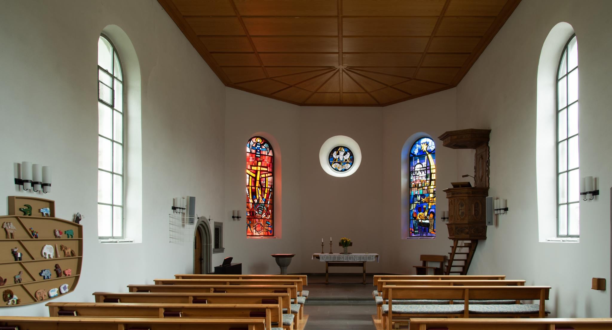 Schiff und Polygonalchor von 1519. Renoviert 1802 und 1874. Innenumgestaltung 1965–66. Chorfenster 1965 von Hans Affeltranger.