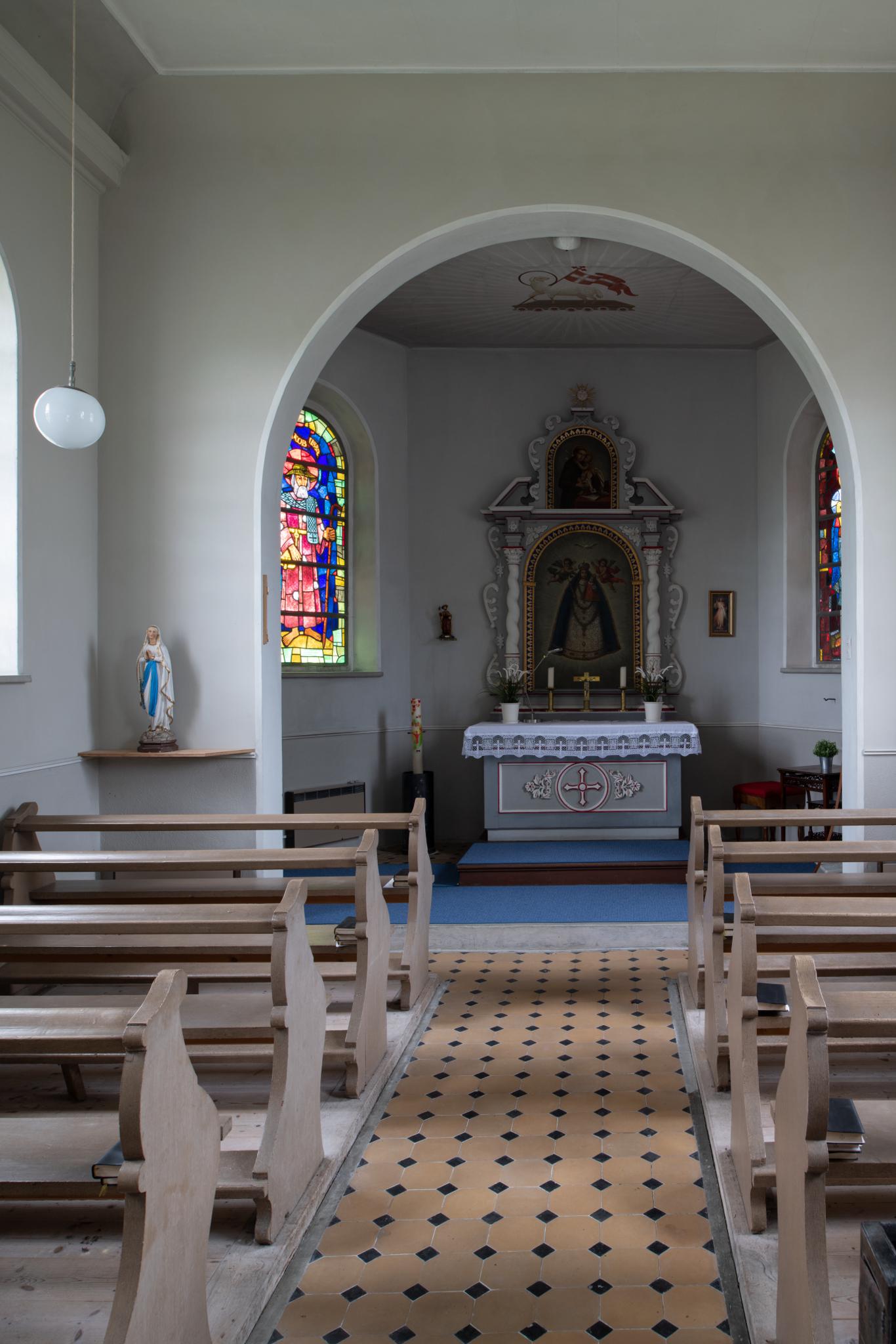 1779–80 erbaut, 1951 renoviert. Chorfenster mit Heiligenfiguren von Gottlieb Engeler.