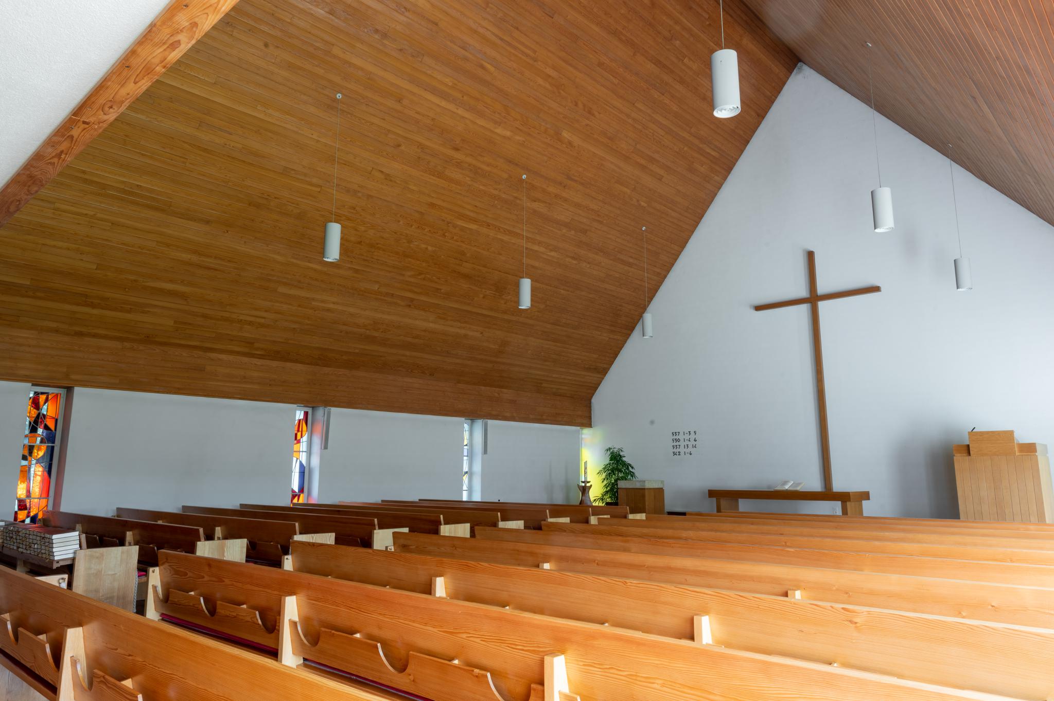 Erbaut 1962/63, nach Plänen von Adolf Kellermüller. Bauzeitliche Glasmalereien von Jacques Schedler in der Ostfassade.