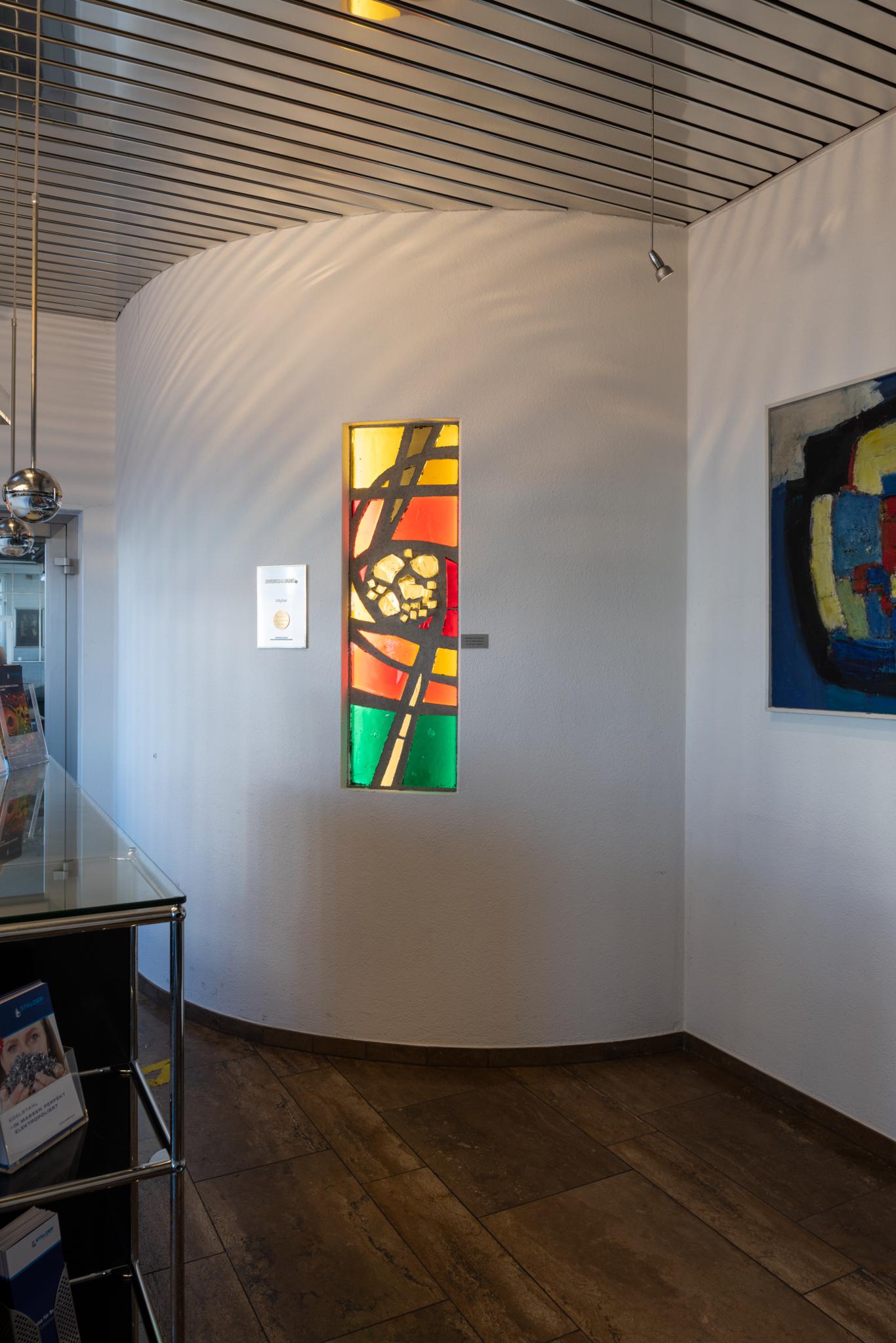Geschäftshaus des Familienunternehmens Stalder, welches 1959 durch Isolde und Eugen Stalder in Engelburg gegründet wurde. Die Firma, seit 1973 Stalder AG, konzentriert sich auf die Metallverarbeitung und -veredelung. Der um 1974 errichtete Geschäftstrakt an der Breitschachenstrasse in Engelburg SG wurde im Jahr 1978 um ein Wohnhaus mit angeschlossener Doppelgarage in Sichtbeton erweitert. Der Glasmaler Heinrich Stäubli, der in Engelburg sein Atelier hatte, fertigte zwei architekturgebundene Betonverglasungen für Geschäftshaus und Garage an (HS_1032; HS_1033).