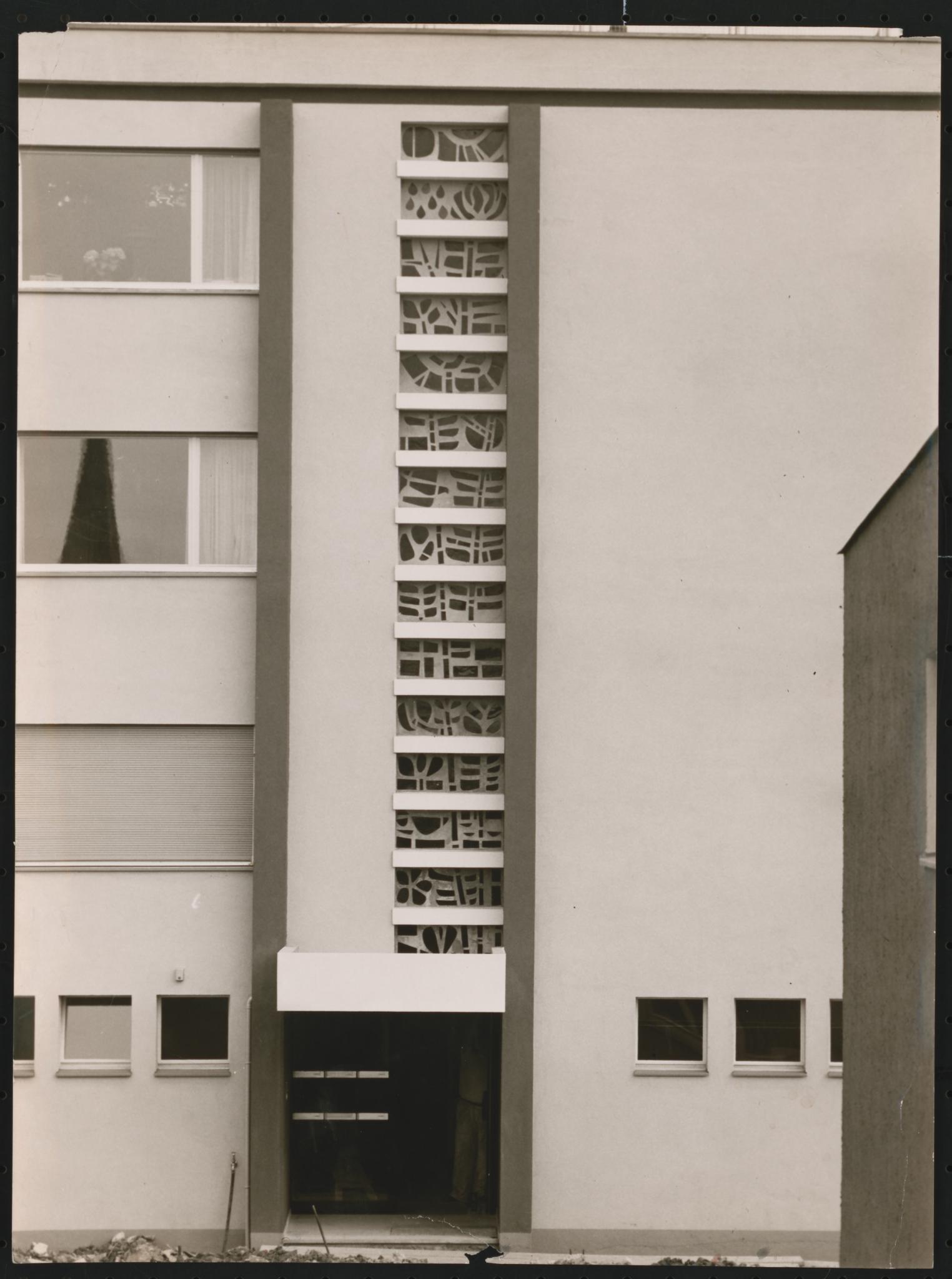 Ernst Krummenacher (*1919) liess das viergeschossige Mehrfamilienhaus im Stadtteil St. Georgen im Jahr 1960 durch das St. Galler Architekturbüro Willy Stäbler (1920–2011) errichten. Es handelt sich um einen schlichten Putzbau unter Flachdach; einzelne Bauelemente werden durch hellroten Anstrich hervorgehoben (bspw. Balkone). Für die künstlerische Ausstattung beauftragte Krummenacher den jungen Künstler und Glasmaler Heinrich Stäubli (1926–2016), eine grossformatige Betonverglasung zu entwerfen und im Sommer 1960 auszuführen. Die Betonverglasung ist als vertikales Band oberhalb des Eingangsbereich in die Fassade eingelassen. Die Platzierung der Glasmalerei lässt fälschlicherweise ein dahinter liegendes Treppenhaus vermuten. Tatsächlich wird das Langbau durch ein mittig liegendes Treppenhaus erschlossen, die Betonverglasung zieht sich stattdessen durch alle Geschosse und die zugehörigen Wohnungen.