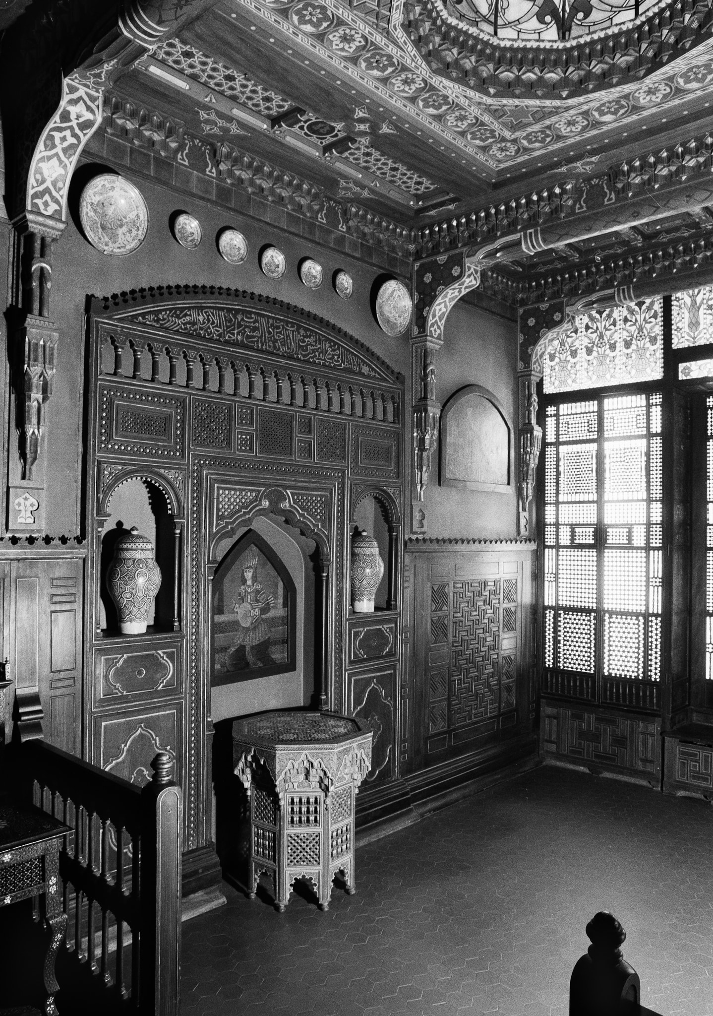 The fumoir is composed of both original pieces of furniture from different Islamic regions and contemporary replicas. On one wall, a large replica of a stucco and glass window (IG_64), made by the Parisian glass-painter Auguste Bruin ([1872]–[1908]) in the Western stained-glass technique, is set above a mashrabiyya thought to be of North African origin.* After the transfer of the *fumoir to Bern, a glass dome was added in the centre of the wooden ceiling to replace the original wooden dome designed by Saladin.