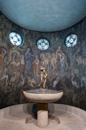 L'église de Murist constitue une très intéressante réalisation du Groupe de Saint-Luc, avec l'avantage d'avoir conservé dans l'ensemble sa polychromie d'origine. Malgré un souhait de la paroisse d'éclaircir l'intérieur de l'église à la fin des années 1970, la Commission cantonale des Monuments historiques recommande de ne procéder qu'à un rafraîchissement des peintures et de maintenir les couleurs originelles (Chatton, 1979). Cette polychromie imaginée par Landry est principalement articulée autour de teintes chaudes : le rouge sombre, le jaune et le brun, qui sont déclinés dans l'ensemble de la décoration : vitraux, antependium, peintures murales et carrelage, et mis en valeur par la présence du bois pour les portes et le mobilier, fourni par la maison Held de Montreux. Le baptistère constitue l'un des éléments parmi les plus intéressants de la production de Fernand Dumas et des artistes du Groupe de Saint-Luc. Sa disposition au centre du massif sud-ouest de l'église, dans l'axe, le met directement en dialogue avec l'abside du choeur auquel il répond par sa forme circulaire, tout en contrastant par sa décoration aux teintes aquatiques, oeuvre de Landry, avec la chaude mise en couleur de la nef et du choeur.