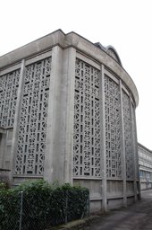 Aucune chapelle n'était initialement prévue dans le projet du concours. Ce sont les Tertiaires de l'ordre franciscain qui réclament la construction d'un lieu de culte dont ils estiment la présence nécessaire dans une Université catholique, et dont ils proposent d'assumer une partie du financement (Siradovic, 2011, p. 266). Sur les projets de mai 1938 établis par le bureau Dumas & Honegger, les architectes prévoient de l'intégrer dans la prolongation du hall d'accueil du bâtiment des séminaires, au nord-est, où elle sera construite (Dumas et Honegger, 1938). L'exiguïté de l'espace qui lui est dévolu, pensé pour accueillir 80 personnes, est compensée par la possibilité d'ouvrir largement les portes de l'entrée et de s'adjoindre l'espace du hall. Malgré la modestie de ce lieu de culte, Honegger et Dumas livrent un travail soigné dans lequel transparaissent encore plus fortement les liens avec Notre-Dame du Raincy de Perret. Les bancs sont distribués en largeur autour d'un choeur au chevet droit légèrement arrondi, avec une sacristie disposée sur le flanc nord-est du bâtiment, dissimulée depuis la nef par un panneau de béton. Comme au Raincy, les façades sont constituées de claustras de béton ajouré composés de différents motifs en béton moulé. Sur chacune des onze parois qui délimitent l'espace intérieur de la nef et du choeur, de grandes croix latines scandent les panneaux, dont chaque portion est ornée de motifs géométriques disposés suivant un plan précis. L'axe central de la chapelle est marqué par une voûte tronconique autoportante reposant sur des colonnes libres de béton cannelé (Dumas et Honegger, [1941], p. 66) dont la pente s'abaisse en direction du choeur, suivant un type que l'on retrouvera à l'église du Christ-Roi de Fribourg, autre oeuvre d'Honegger et Dumas dans le chef-lieu fribourgeois (Daucourt, 1998, p. 352-363).