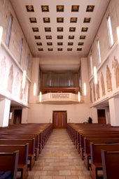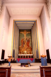 L’église, comprenant 550 places assises, est conçue sur un plan basilical à trois nefs avec un clocher latéral et un baptistère. Pour sa décoration, sont appelés plusieurs artistes membres ou proches du Groupe de Saint-Luc, dont l'architecte Guyonnet fait également partie. La façade d’entrée est ornée d'une mosaïque illustrant la Résurrection, œuvre de l'artiste toscan Gino Severini et exécutée à Paris par Louis Barillet entre mars et octobre 1930. Suite à sa pose par un ouvrier de l’atelier parisien, Severini vient sur place effectuer quelques retouches (Radin, 2011, p. 91, 93, 95).