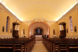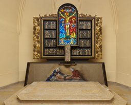 Thévoz réalise également les vitraux des quatre fenêtres du choeur et Faravel un vitrail dans la sacristie, laquelle a été reconstruite par Dumas en 1939 suite à l'incendie qui l'avait détruite en 1921 (Pittet, [2020], p. 101, 110). Jusqu'en 1976-1977, le choeur était orné d'un dais formé de deux colonnes torses soutenant un entablement en volutes surmonté d'une couronne au centre, rappelant la structure imaginée par Dumas en 1927 à l'église d'Echarlens pour porter le retable brodé de Marguerite Naville. Sans doute jugé trop imposant, ce décor architectural en bois a été démonté et déposé lors de la rénovation entreprise entre 1975 et 1977 (Pittet, [2020], p. 186). Le décor peint originel conçu par Faravel, comprenant des symboles eucharistiques sur l'arc du choeur et des Évangélistes autour de la clé de voûte a été partiellement préservé (Diesbach, 1939, p. 57).