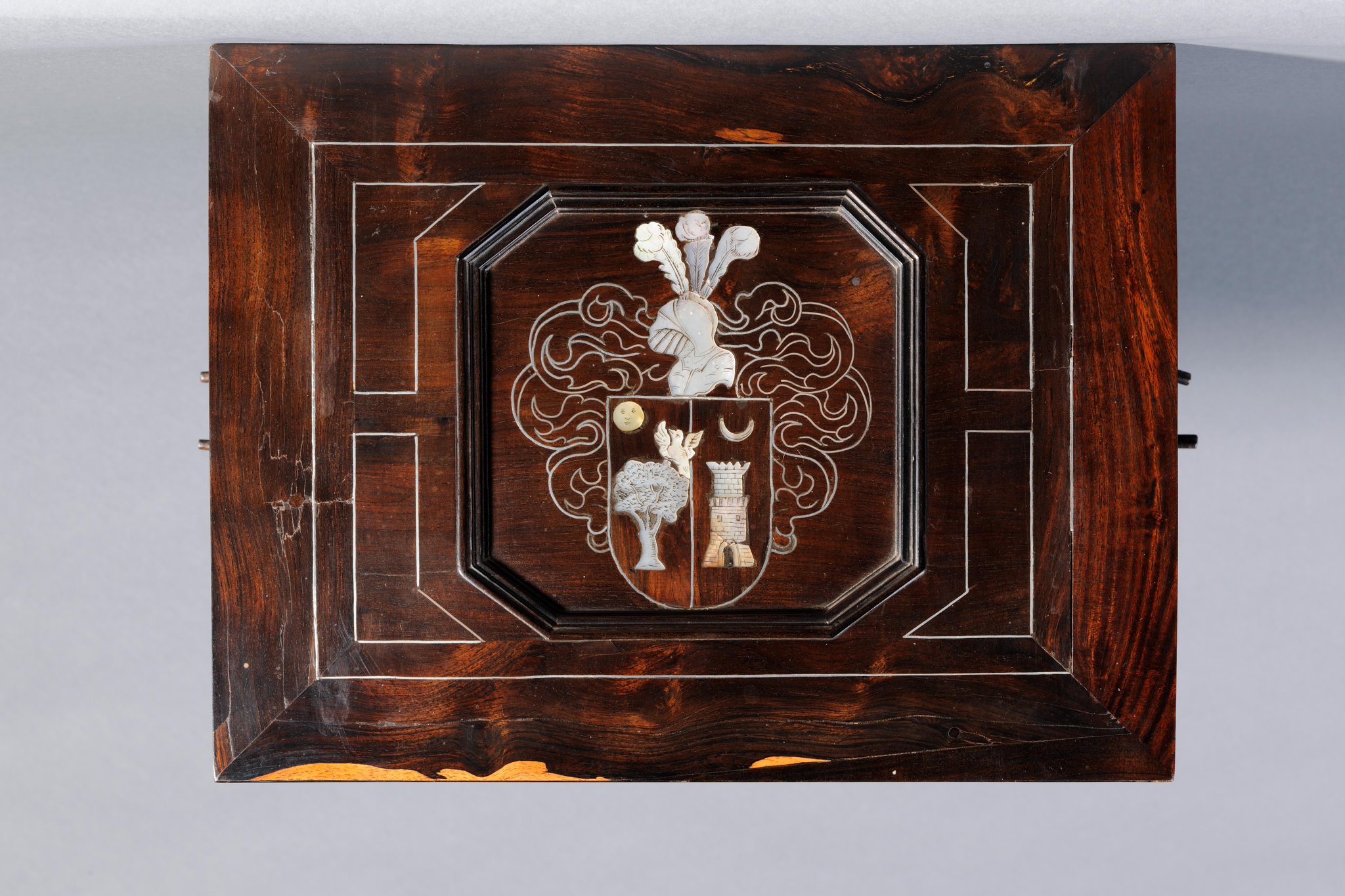 Auf der oberen, im Achteck eingetiefte Fläche: ein mit Perlmutt intarsiertes und graviertes Vollwappen (gespalten, rechts ein Baum mit einem Vogel, im rechten Obereck eine gesichtete Sonne, links ein Rundturm mit Tor, überhöht von einem liegenden Halbmond; Helmdecke und Stechhelm mit Federbusch).