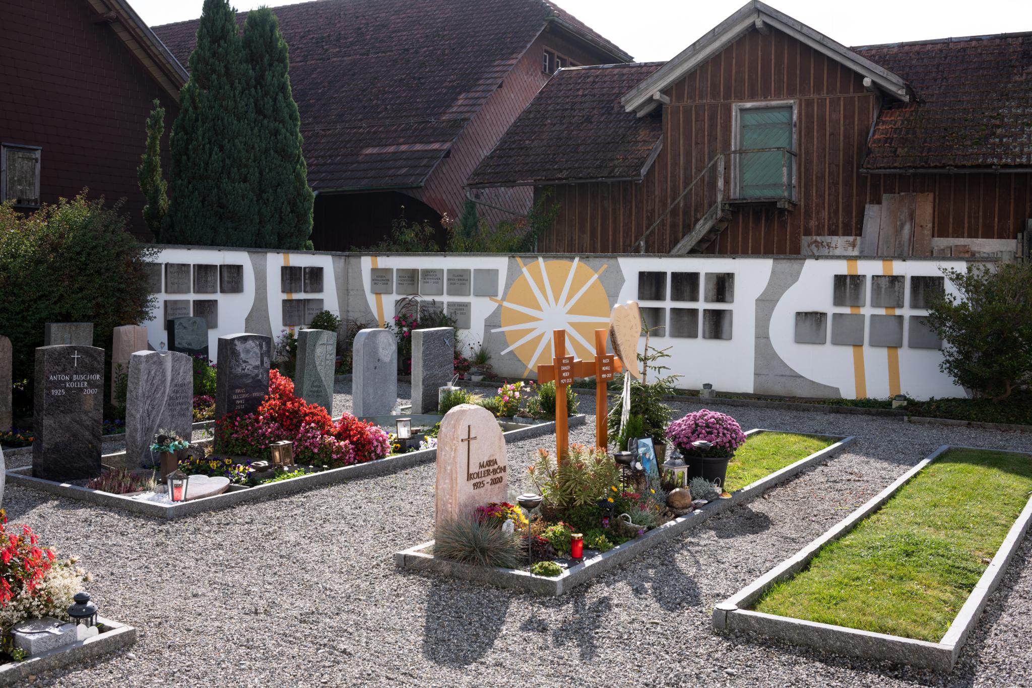 : Friedhof Muolen mit der Wandmalerei und Schmiedeeisen-Dallglas-Skulptur von Heinrich Stäubli