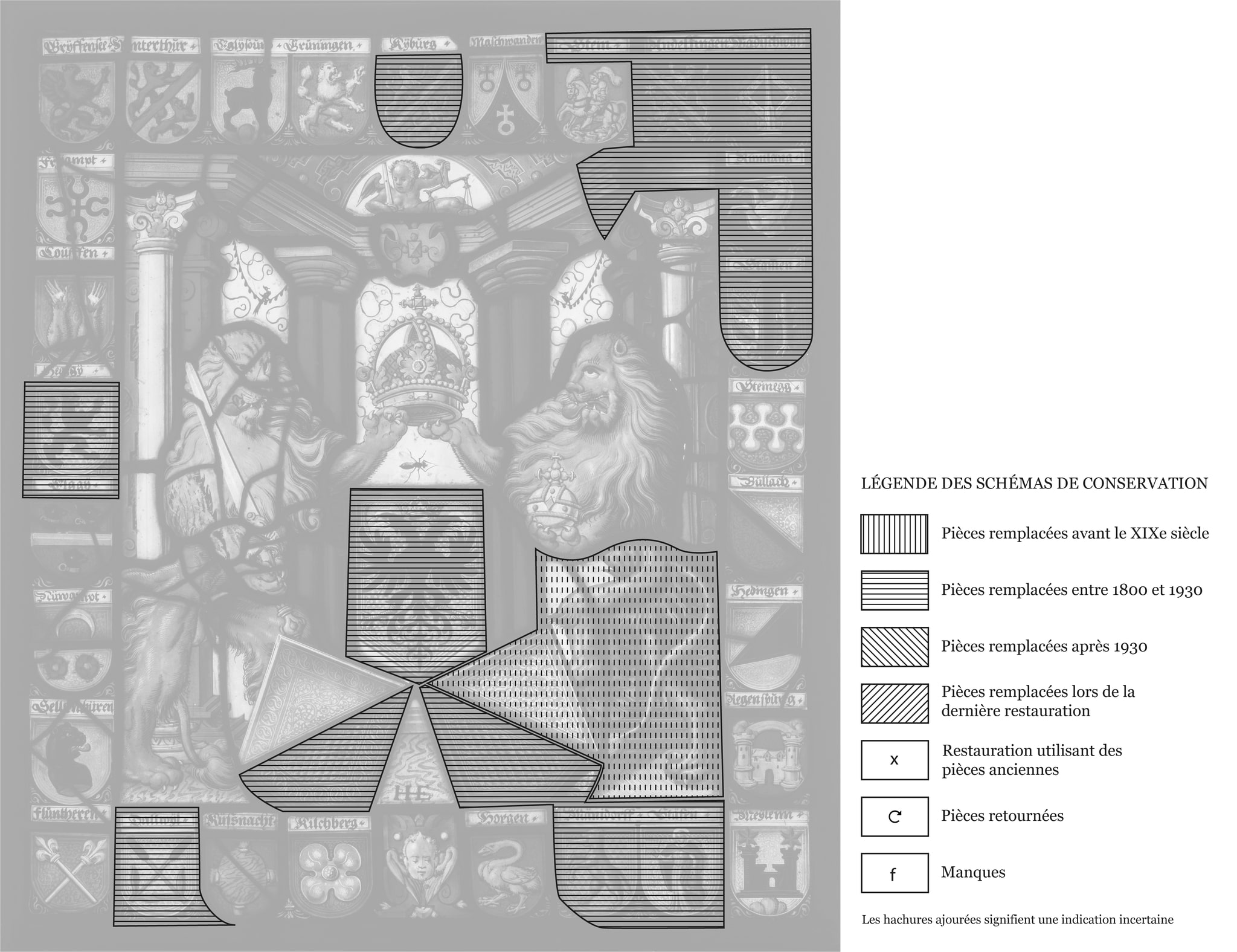 Schéma du vitrail aux armes du canton de Zurich et de vingt-neuf de ses seigneuries
