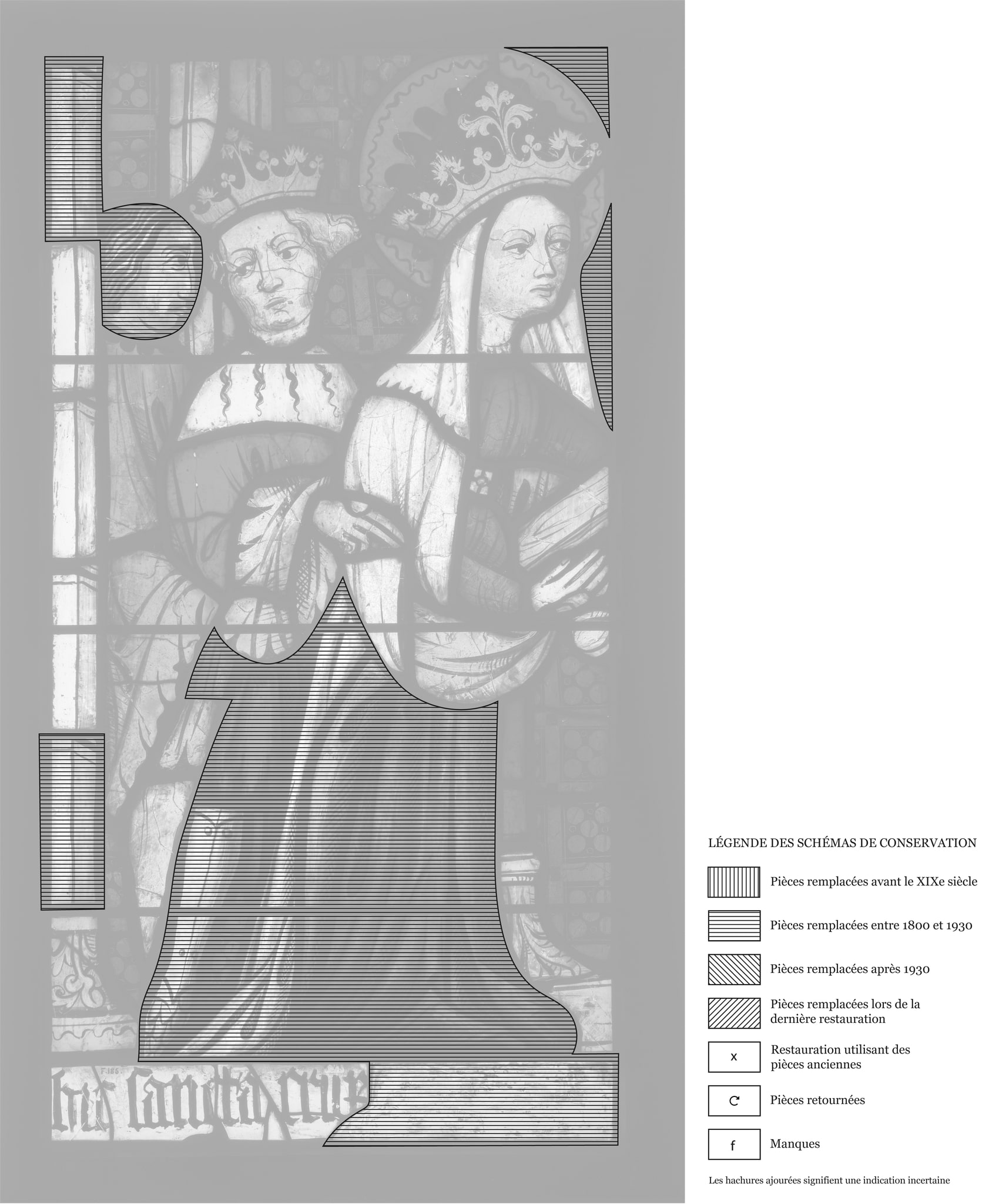 Schéma du vitrail de Sainte Hélène ressuscitant une morte avec la Vraie Croix (panneau gauche)