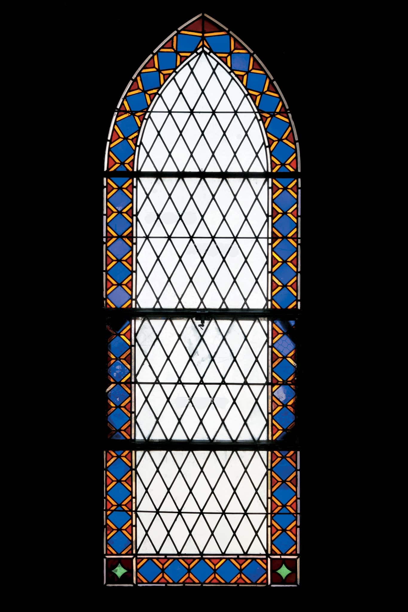 Vitrail décoré de verres blancs montés en losanges et encadré d’une bordure colorée