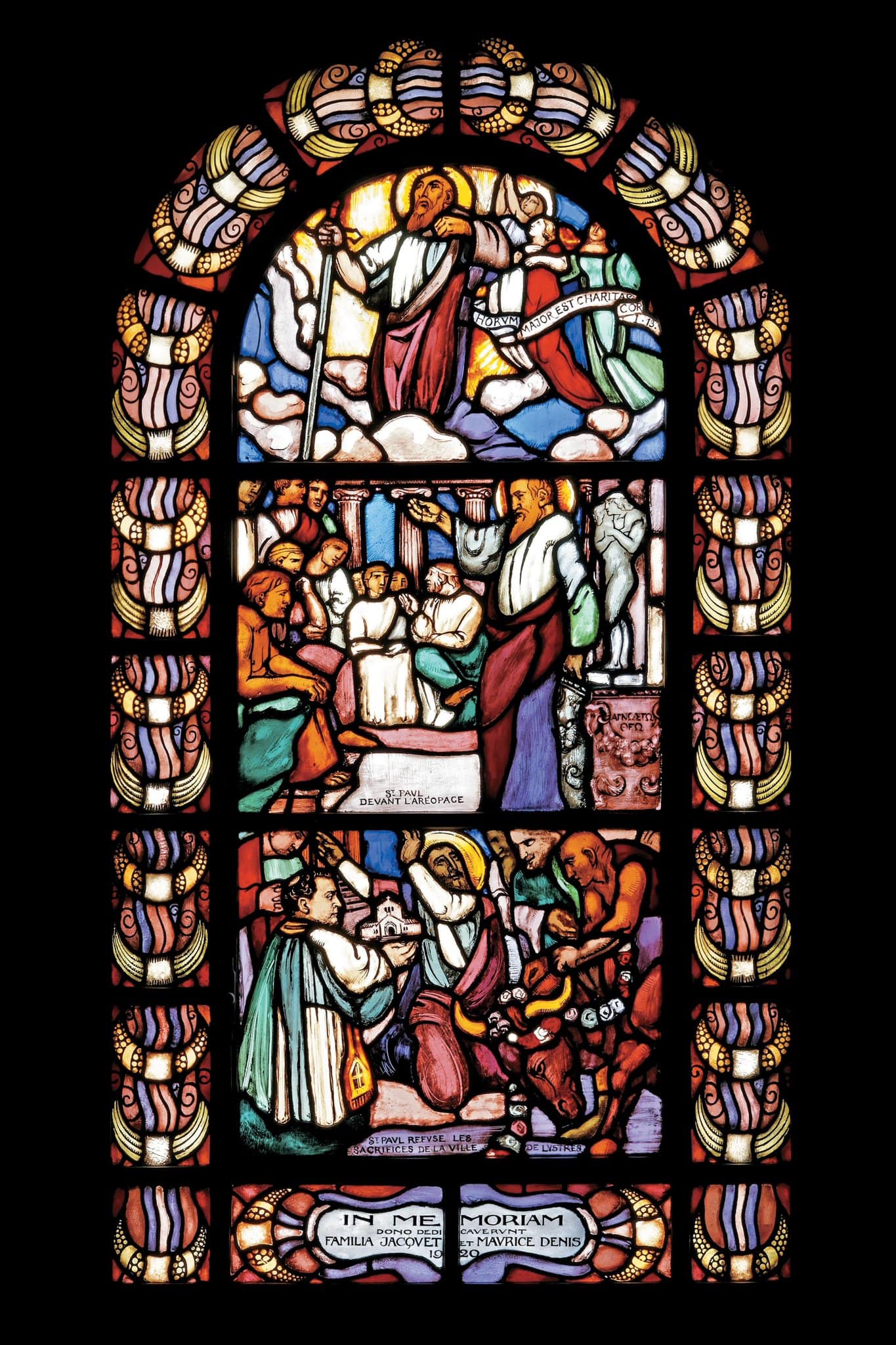 A l’instar des réalisations antérieures de Brunner, Poncet et Cingria, Denis opte pour une palette de couleurs analogue pour les scènes figurées et la bordure. Il choisit une gamme de teintes plutôt douces, dominées par des coloris verts, bleus et ocre, qu’il contrebalance avec une présence importante de blanc. Ses scènes relatent des épisodes de la vie de saint Paul, à l’instar de sa toile marouflée. Le vitrail étant conçu en souvenir de l’abbé Jacquet, Denis le représente sur la scène inférieure, en train d’offrir l’église de Grange-Canal à l’apôtre (Poiatti, 2008, p. 119). L’artiste français choisit, comme Cingria, d’y adjoindre une inscription expliquant l’iconographie de chaque épisode dépeint et, comme Brunner et Poncet, prévoit un cartouche sur la bordure inférieure duquel il mentionne le donateur du vitrail et la dédicace à l’abbé.