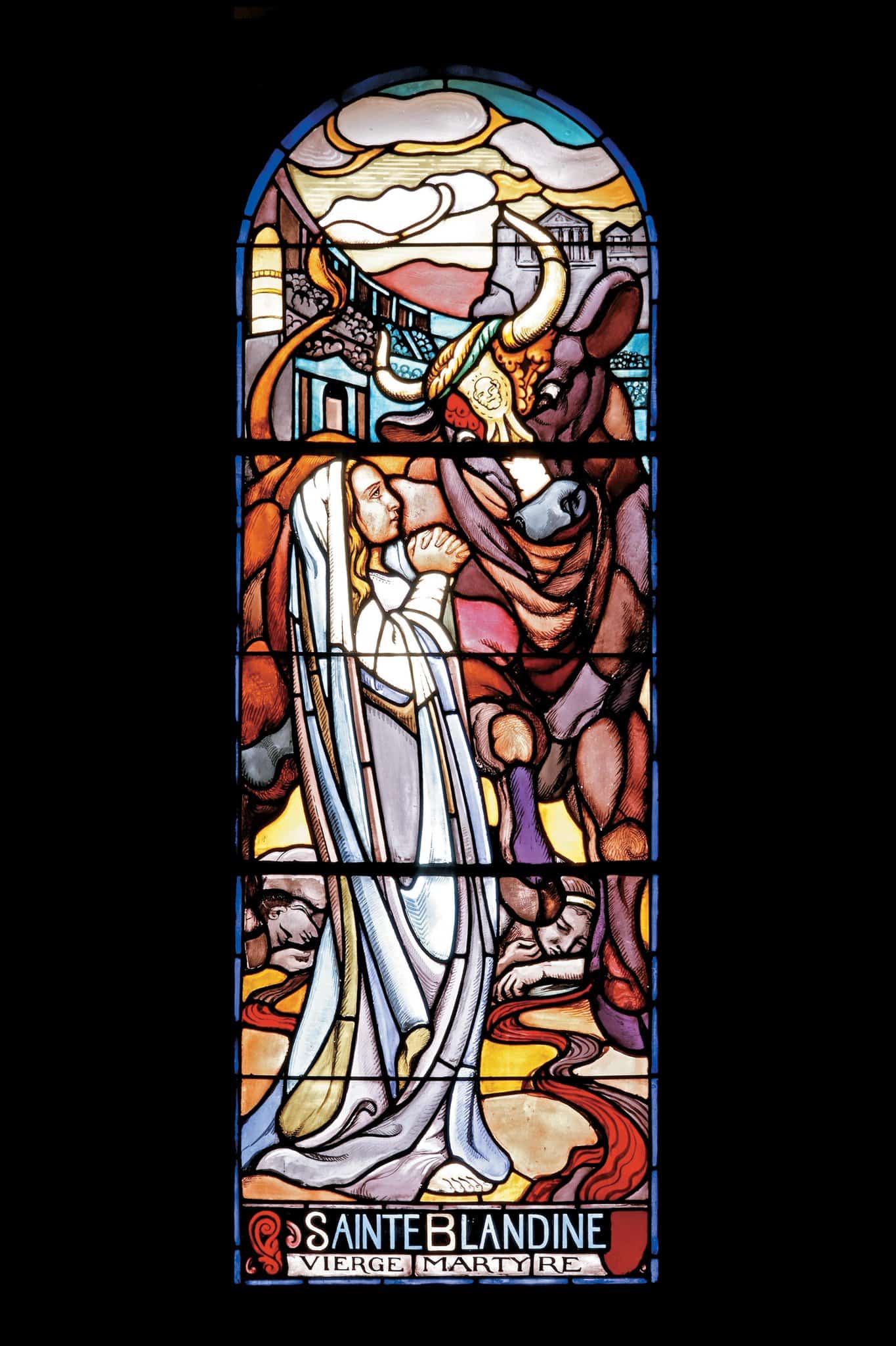 Blandine, jeune chrétienne, a subi le martyre sous le règne de Marc-Aurèle. En 177 dans la cité lyonnaise, elle fut attachée à un poteau au milieu de l’arène et confrontée à un taureau. Celui-ci recula plutôt que de l’attaquer. Finalement, elle fut décapitée, après avoir subi d’autres tortures. Sur le vitrail, elle est présentée en prière devant le taureau menaçant (“Les nouvelles œuvres de Maurice Denis […]”, 1923).