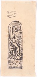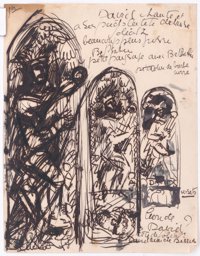 En ce qui concerne les travaux préparatoires, il s’agit majoritairement d’esquisses, qui rendent compte de l’étude poussée que l’artiste mène pour établir l’attitude, l’expression et même la psychologie des figures qu’il souhaite représenter. Plusieurs croquis sont accompagnés de petites notes brossant à grands traits le caractère des personnages : Moïse « yeux noirs perçants, tête de bélier » (MP_01.53), Melchisedech « yeux fendus, figure mystérieuse » (MP_01.62). Ces inscriptions rendent également compte des sources visuelles et culturelles dans lesquelles Poncet puise son inspiration : les ballets russes, des textes de Shakespeare, Don Quichotte. Grand admirateur de Rembrandt, il est aussi possible que Poncet se soit inspiré des estampes de l’artiste sur le thème du Sacrifice d’Isaac pour ses premières esquisses du vitrail d’Abraham (MP_01.51 ; MP_01.55). L’art médiéval constitue une autre grande source de ce cycle, et plus précisément des modèles issus de la sculpture monumentale chartraine. Dans une page de note de sa main liée au cycle des vitraux de la tribune des orgues, il évoque le porche septentrional de Chartres où sont représentés, entre autres, Melchisedech, Abraham, Moise, et David (Poncet, [1924]). Il place ses figures au sein d’un encadrement architectural qui évoque la niche dans laquelle sont placées les statues, de même que le soubassement sur lequel elles reposent. Il leur confère un aspect hiératique et les soumet à une certaine déformation, notamment la partie basse du corps de David, tandis que le traitement en camaïeu avec de forts clairs-obscurs crée un effet de modelé qui évoque la pierre et la sculpture, bien que l’artiste ne cherche pas à créer un trompe-l’œil, ni à estomper l’aspect bidimensionnel de l’ensemble (Noverraz, 2014, p. 43-44).