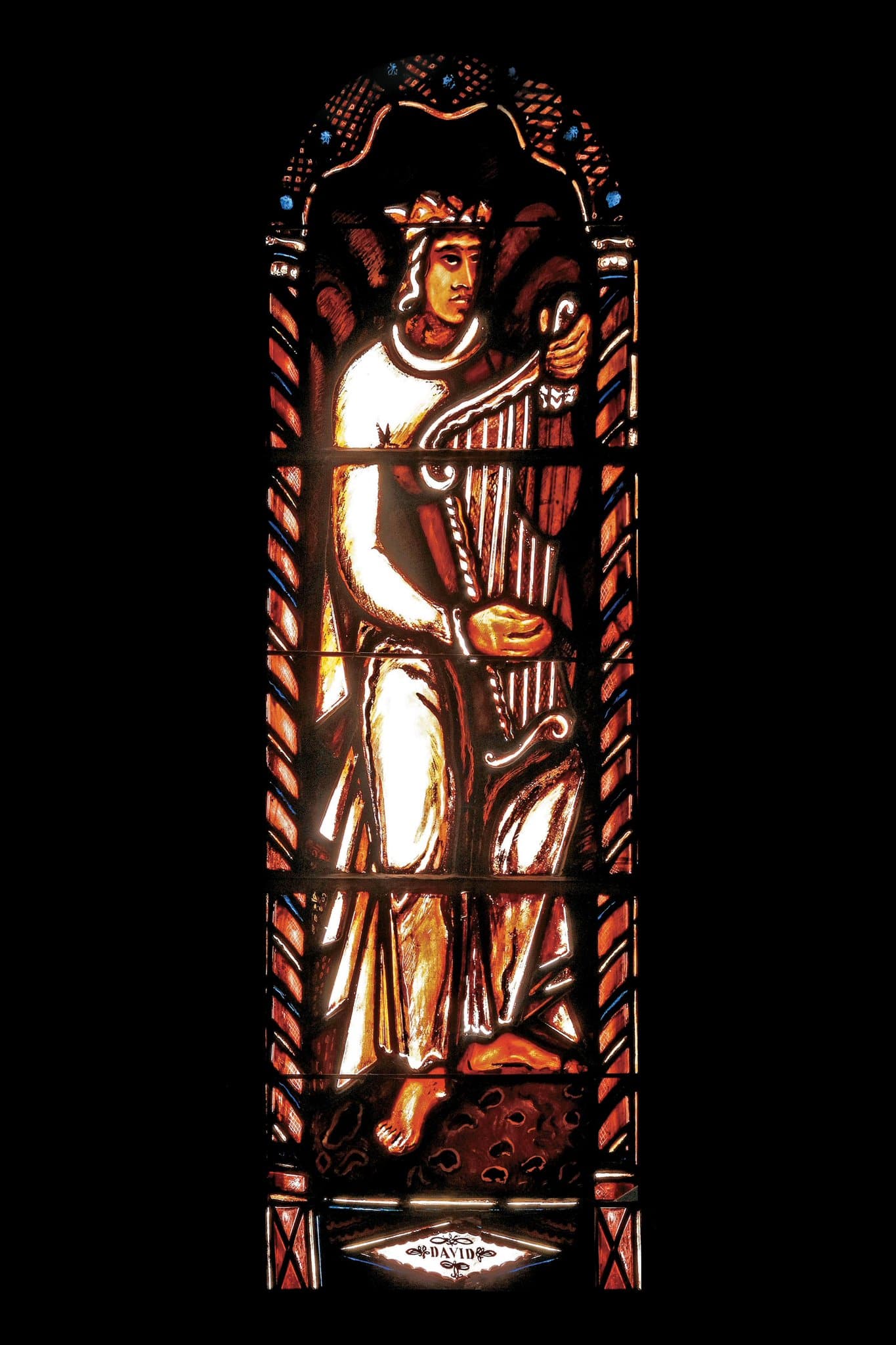 Ce vitrail a été réalisé en 1924 par l’artiste Marcel Poncet dans la tribune des orgues de l’église Saint-Paul de Cologny (GE), dans le quartier de Grange-Canal. Il fait partie d’un ensemble de trois vitraux placés côte à côte, consacrés à David, Moïse et Melchisedech.