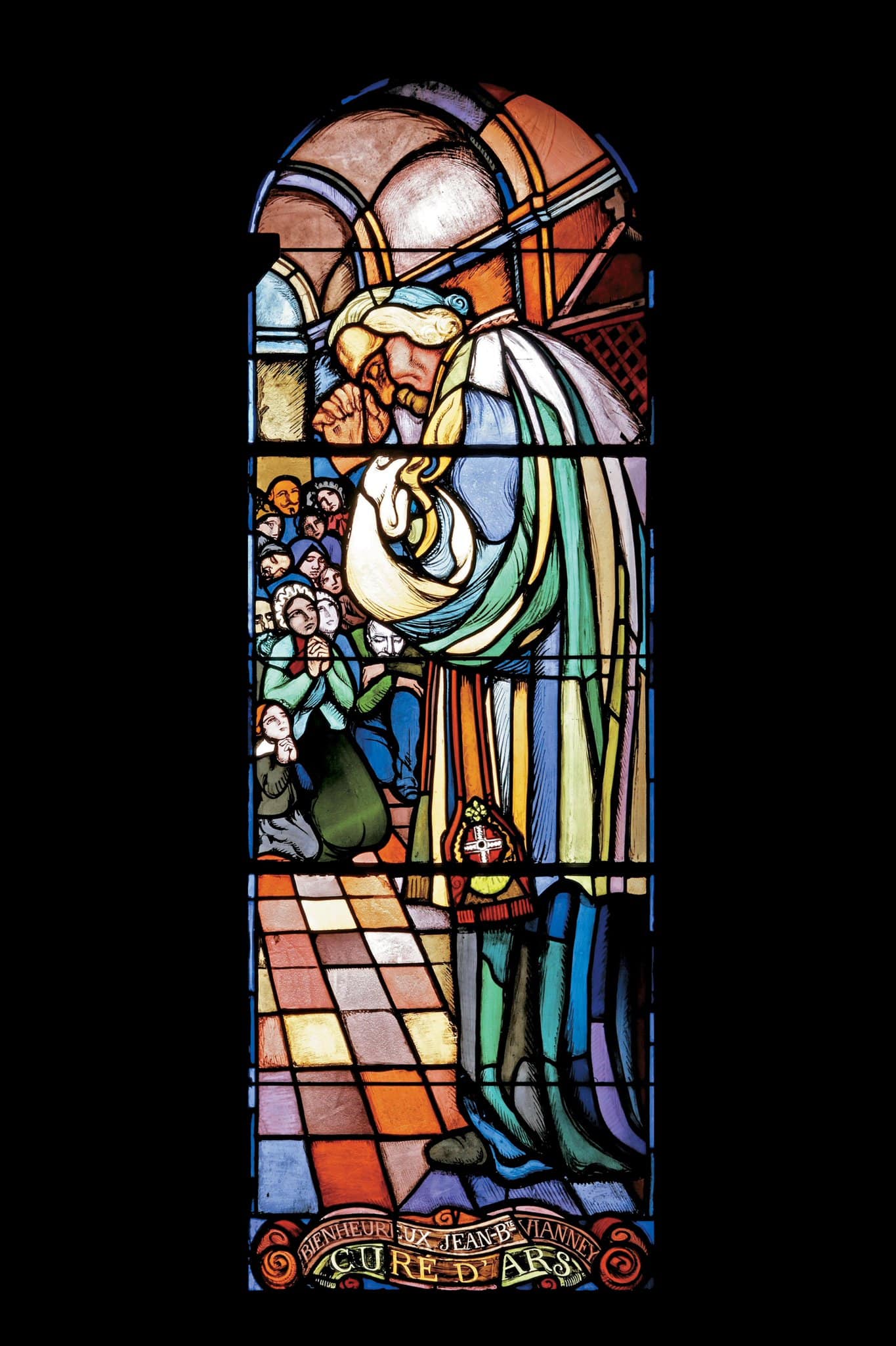 Ce vitrail en plein cintre, consacré au curé d’Ars, a été réalisé en 1918 par Maurice Denis en collaboration avec Marcel Poncet, pour l’une des fenêtres hautes de la nef de l’église Saint-Paul de Cologny (GE), dans le quartier de Grange-Canal.