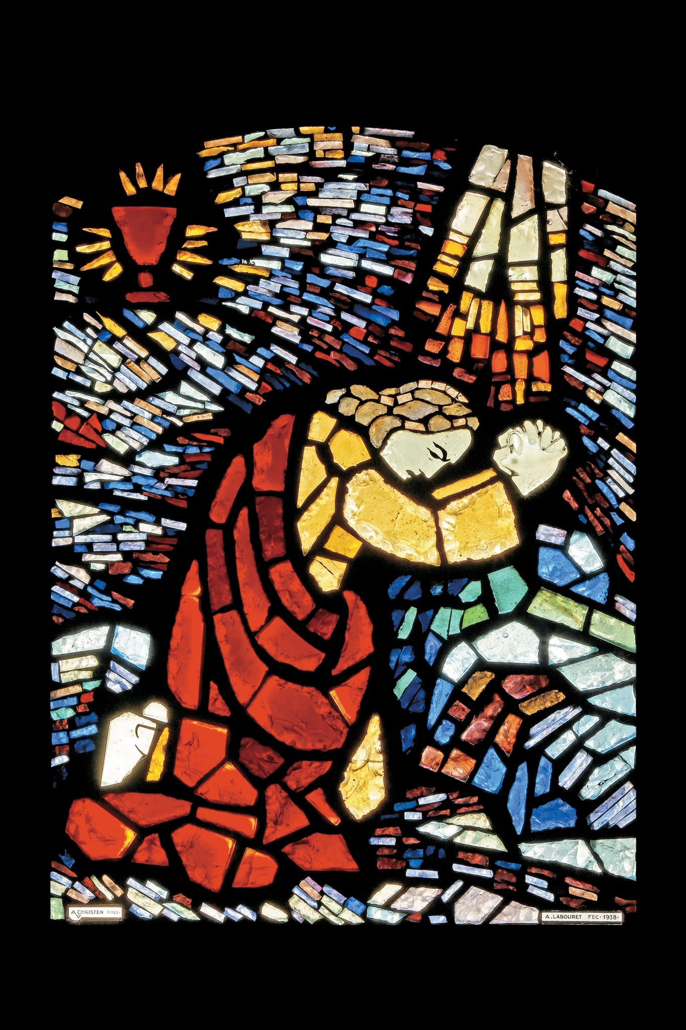 Le Christ, agenouillé, est en prière et des rayons tombent sur lui. En haut à gauche, on voit un coeur rayonnant.