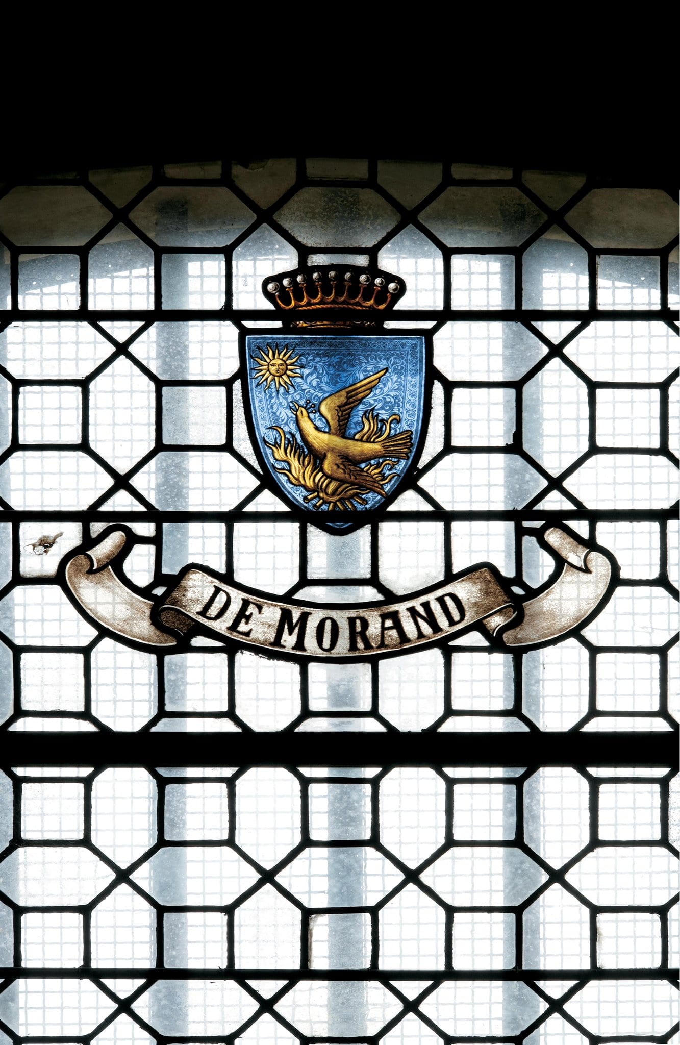 Au sommet du vitrail, les armoiries de la famille Morand sont surmontées d’une couronne.