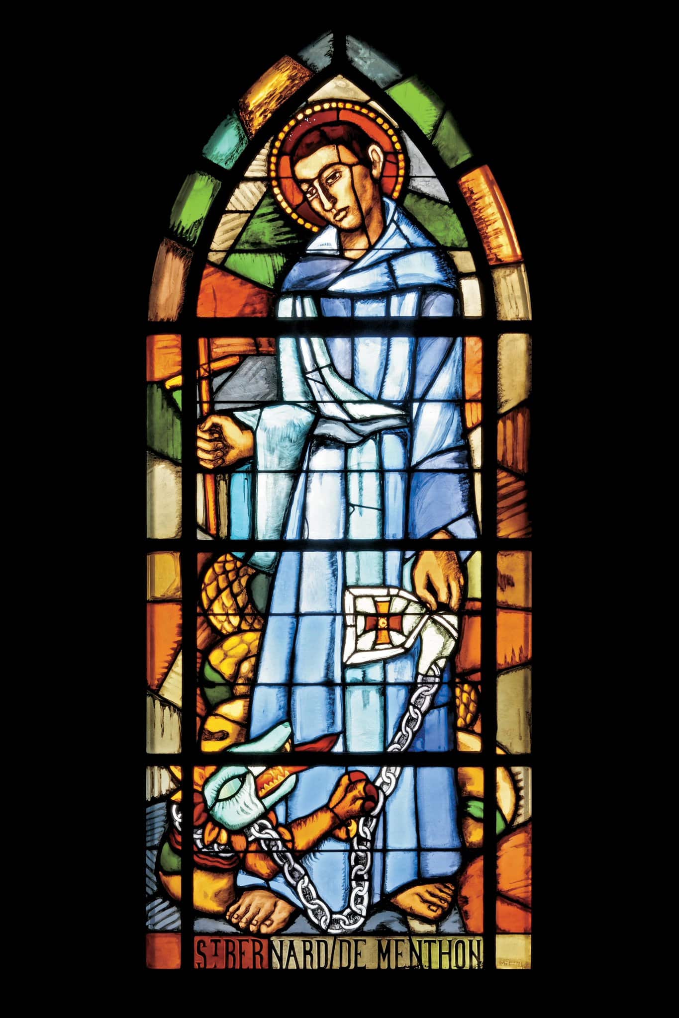 Saint Bernard de Menthon tient un crucifix et un lion enchaîné.