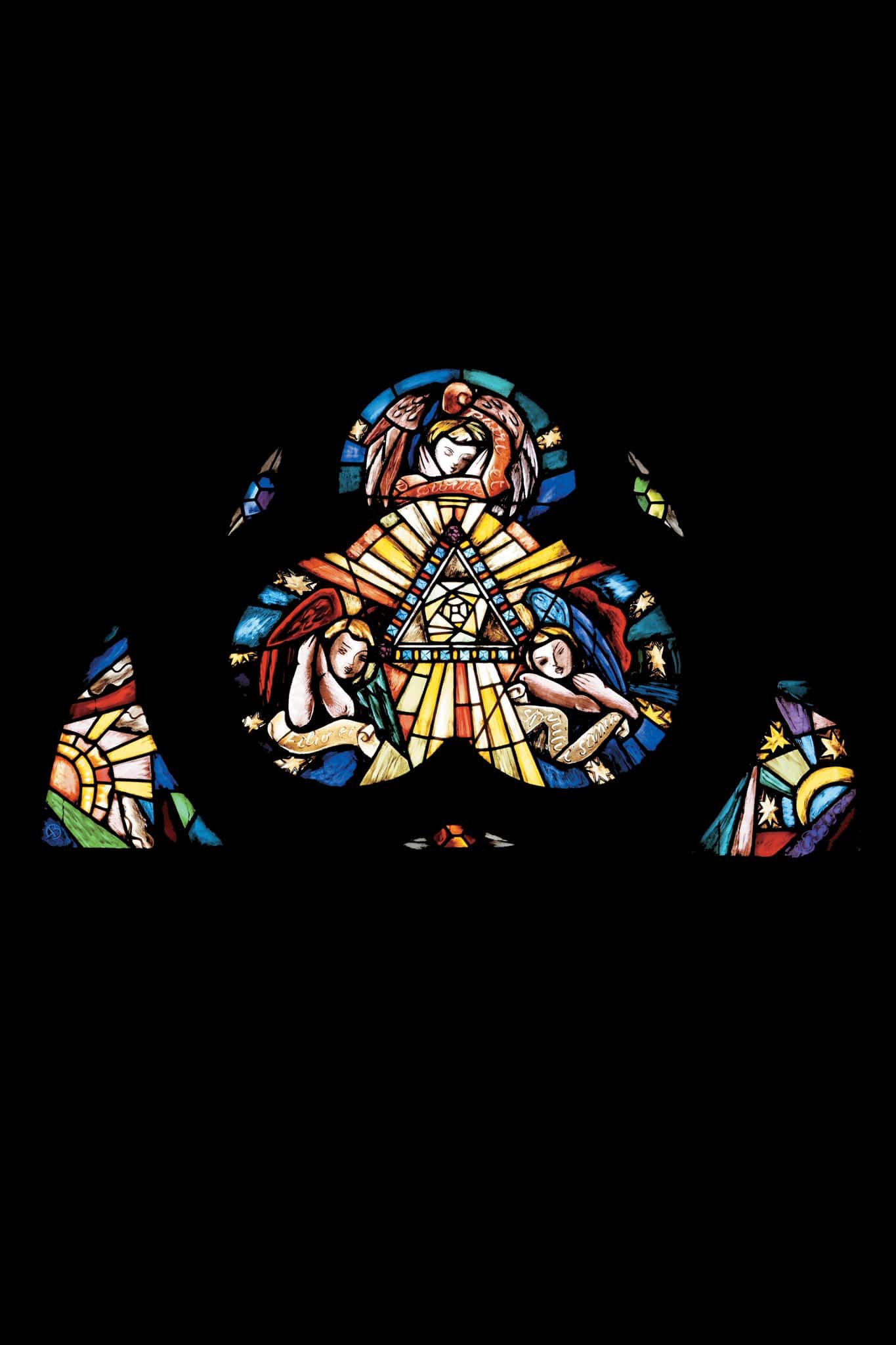 Dans le trilobe, trois anges entourent la Trinité symbolisée par un triangle. A gauche le soleil, à droite la lune.