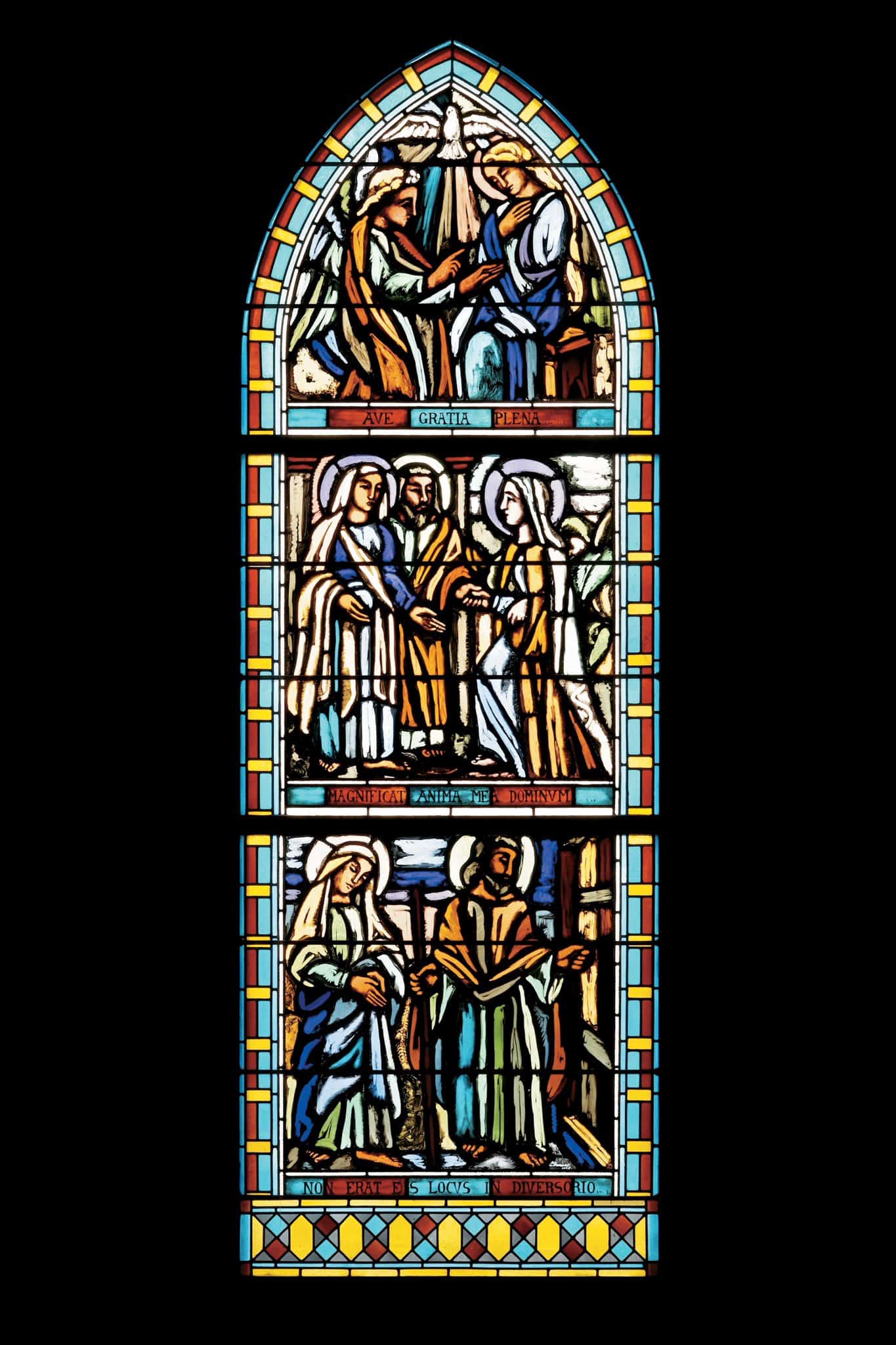 L’Ange Gabriel est devant Marie troublée. Au-dessus d’eux, la colombe du Saint-Esprit. Marie salue Elisabeth et Zacharie. Marie et Joseph arrivent à Bethléem.