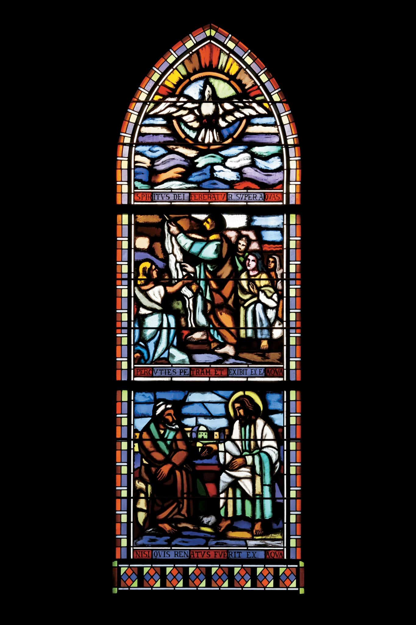 La colombe du Saint-Esprit, les ailes déployées, au-dessus des flots. Moïse frappe le rocher avec son bâton et de l’eau en jaillit pour assouvir la soif du peuple d’Israël. Jésus et Nicodème en discussion. Dans le fond, la ville de Jérusalem.