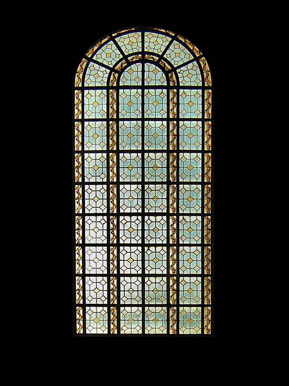 Des motifs végétaux forment un double encadrement et des verres opalescents composent un décor géométrique à l’intérieur.