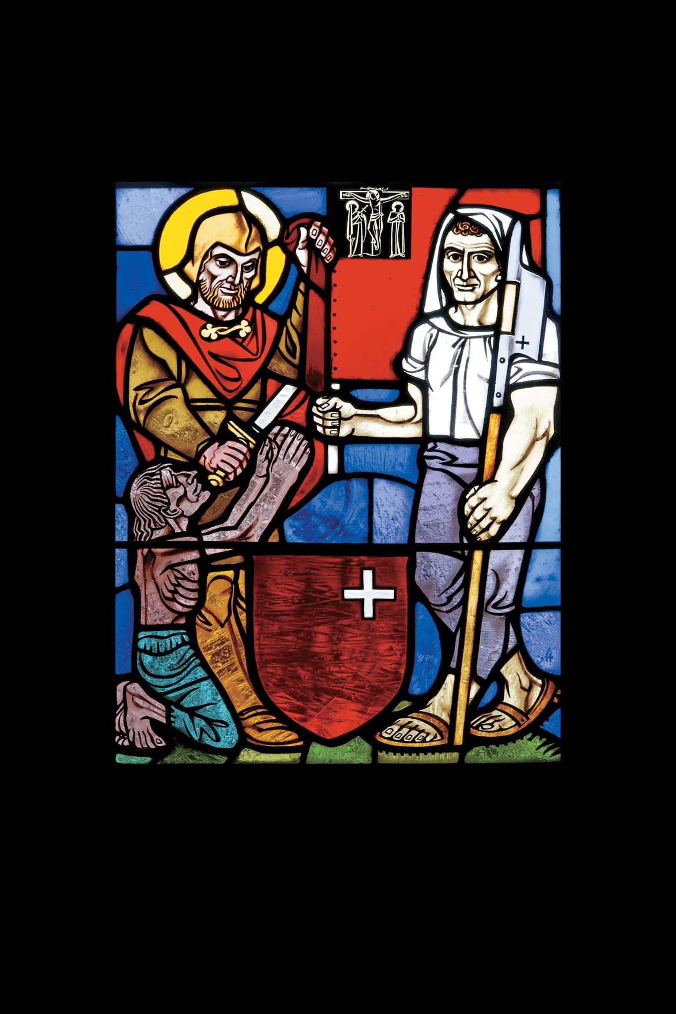 Ce vitrail est incorporé à la partie supérieure d’une vitrerie à bornes.