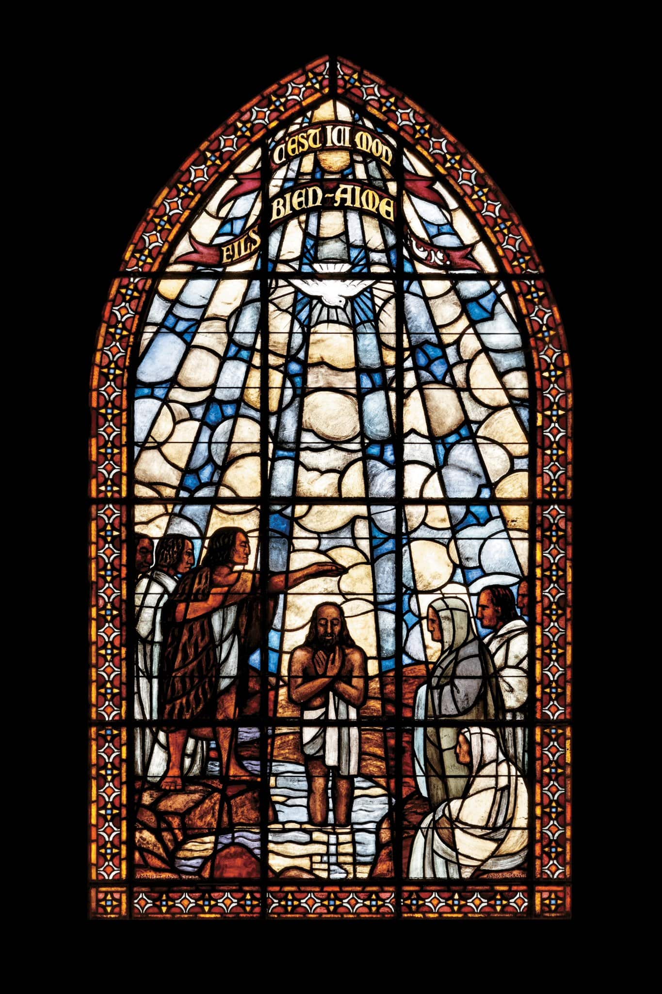Le Christ, debout dans les eaux du Jourdain, est baptisé par Jean, alors que la colombe du Saint-Esprit descend sur lui.