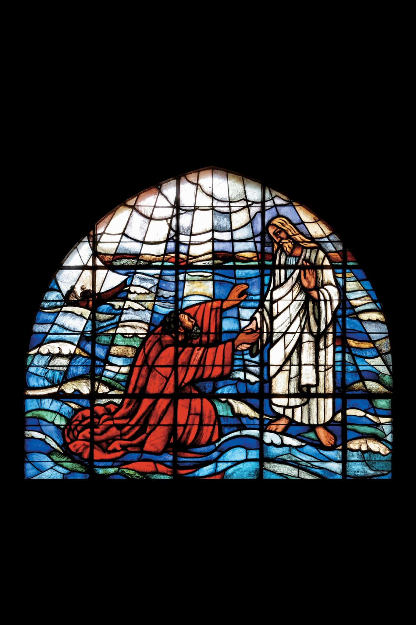 Pierre, effrayé par les vents, supplie le Christ de le retenir.