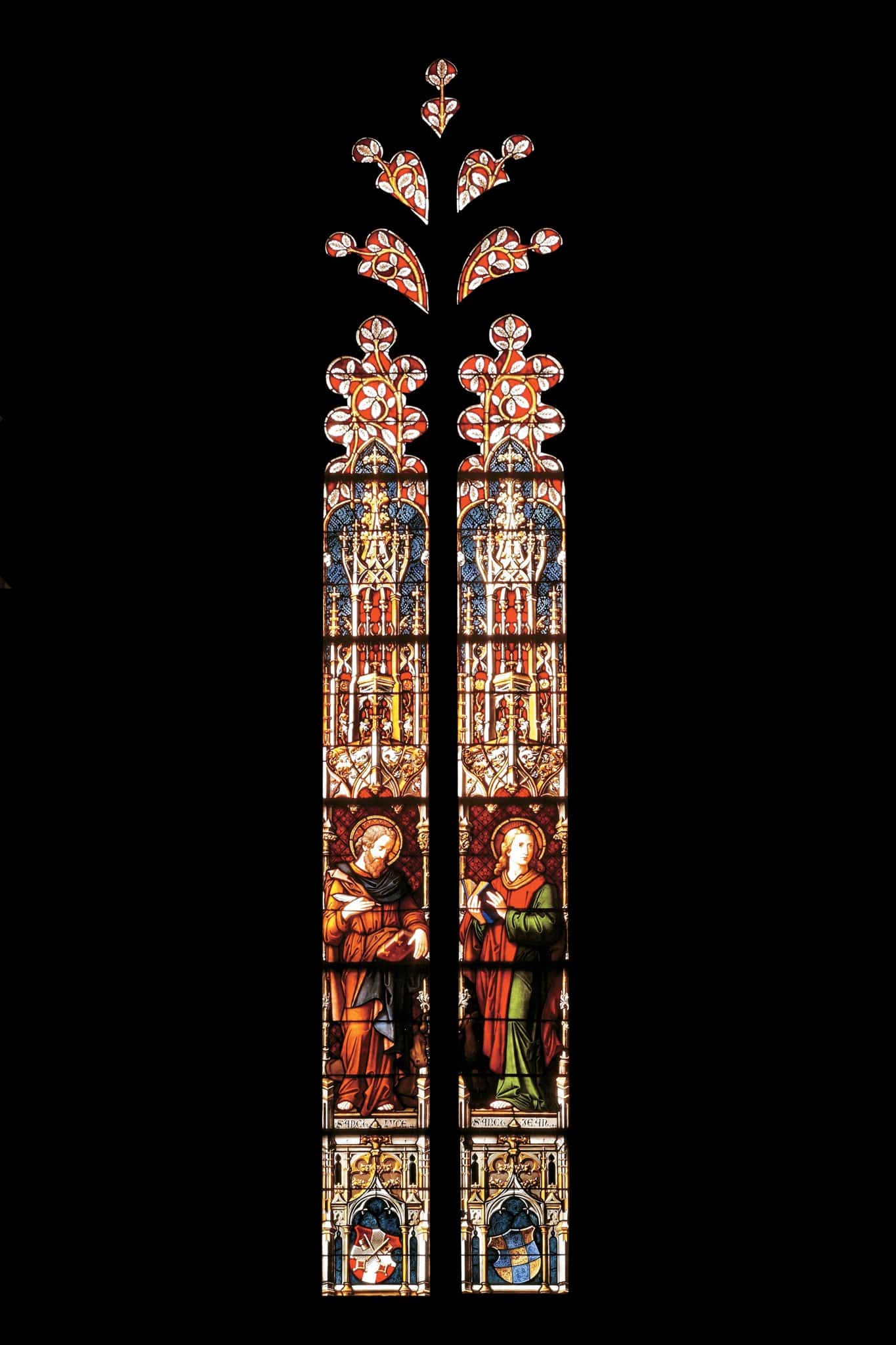 Sur la lancette de gauche, saint Luc écrit son Evangile, un taureau couché à ses pieds. Sur la lancette de droite, saint Jean tient un livre entrouvert, un aigle à ses pieds. Sous les deux lancettes, les armoiries du Vidomnat de Genève et celles des comtes de Genève.