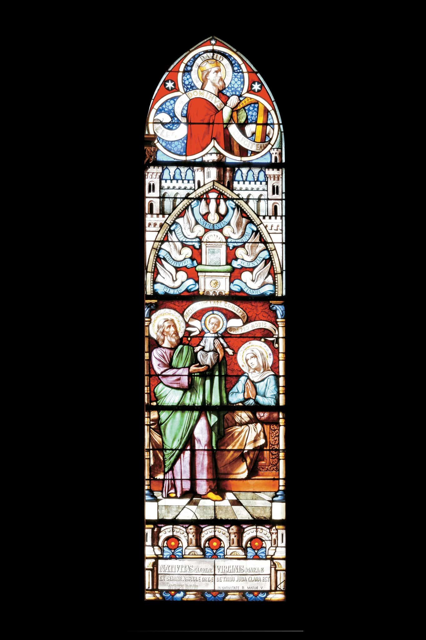 ELEGIT EAM DOMINUS REELEGIT EAM (banderole dans trilobe) / REGINA SINE LABE / CONCEPTA ORAPRO NOBIS (banderole au-dessus de Marie) / NATIVITAS GLORIAE VIRGINIS MARIAE / EX SEMINE ABRAHAE, ORTAE DE TRIBU JUDA, CLARA EX / STIRPE DAVID / IN NATIVITATE B. MARIAE V. (cartouche en bas)