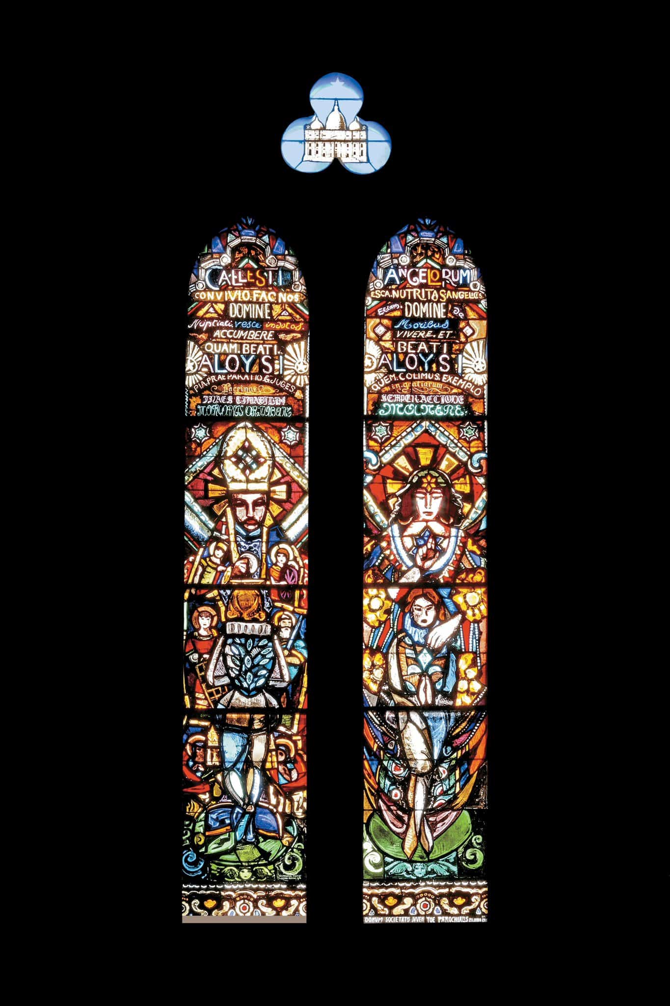 Au sommet, dans un trilobe, on trouve la Basilique Saint-Pierre de Rome. Sur la lancette de gauche, saint Louis de Gonzague, de dos, communie. L’évêque tient l’hostie. Sur la lancette de droite, saint Louis s’avance sous la protection de son ange gardien.