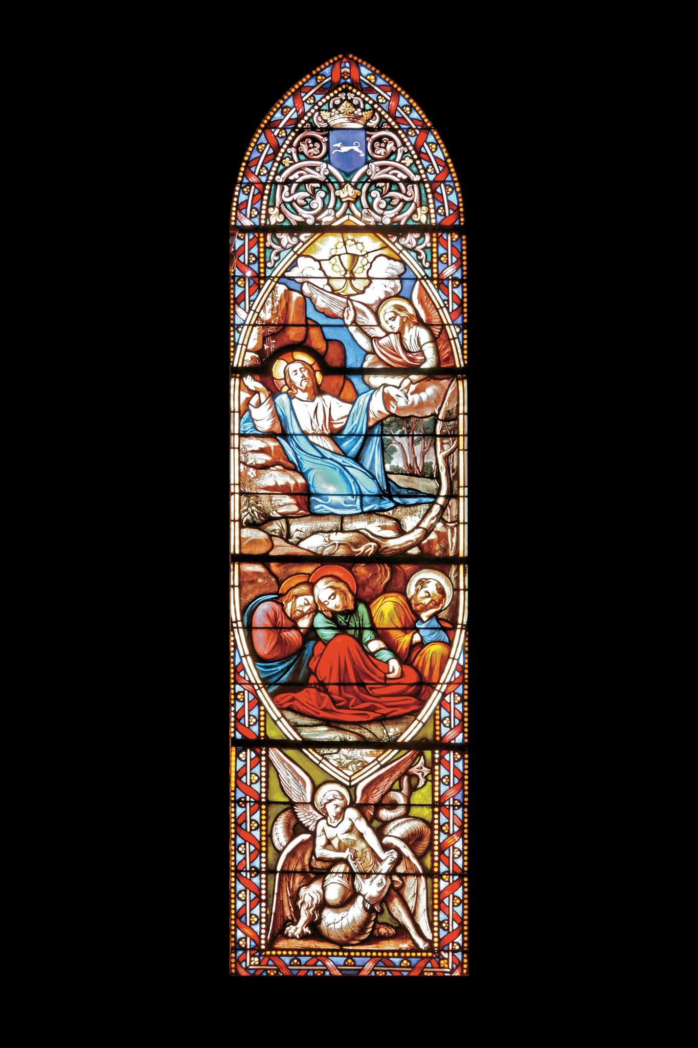 Au sommet, des armoiries. Au centre, Jésus prie au Jardin des Oliviers. Un ange lui apparaît et lui montre une coupe. A ses pieds dorment Pierre, Jacques et Jean. En-dessous, l’archange Michel tue le dragon.