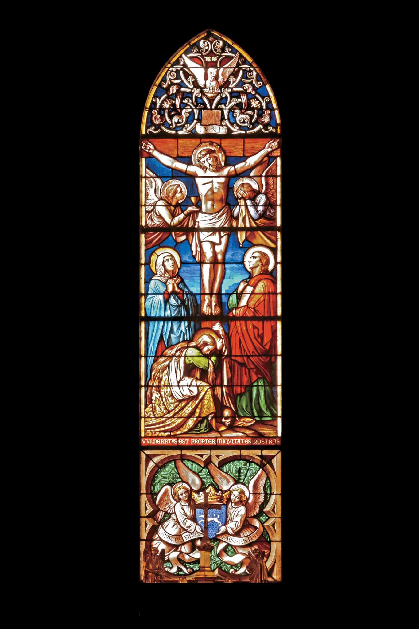 Au sommet, un pélican se transperce le ventre. Au centre, le Christ crucifié est entouré de Marie, Marie Madeleine et Jean. Un ange recueille son sang dans un calice, alors qu’un autre se cache le visage. En-dessous, des armoiries tenues par deux anges.