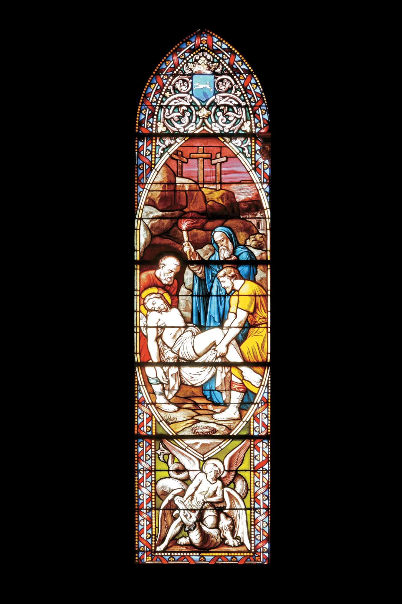 Au sommet, les armoiries de la Famille Nicolaï. Au centre, trois hommes mettent le corps du Christ dans le tombeau. Au second plan, on aperçoit le calvaire. En-dessous, l’archange Michel tue le dragon.