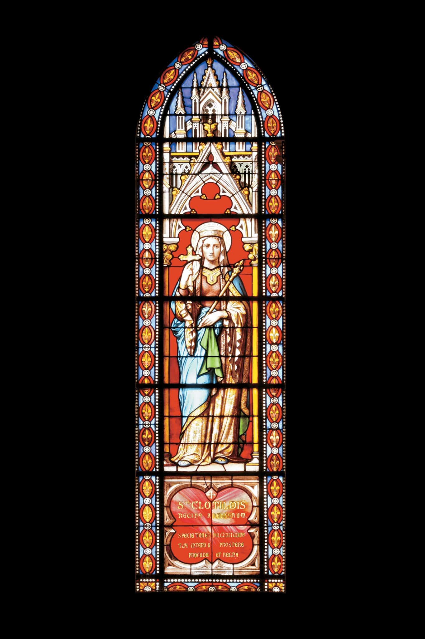 STA CLOTILDIS / REGINA FRANCORUM / SPECIE TUA ET PULCHRITUDINE / TUA INTENDE PROSPERE / PROCEDE ET REGNA (INSPIRE DE PS. 44.5) (quadrilobe sous la sainte)