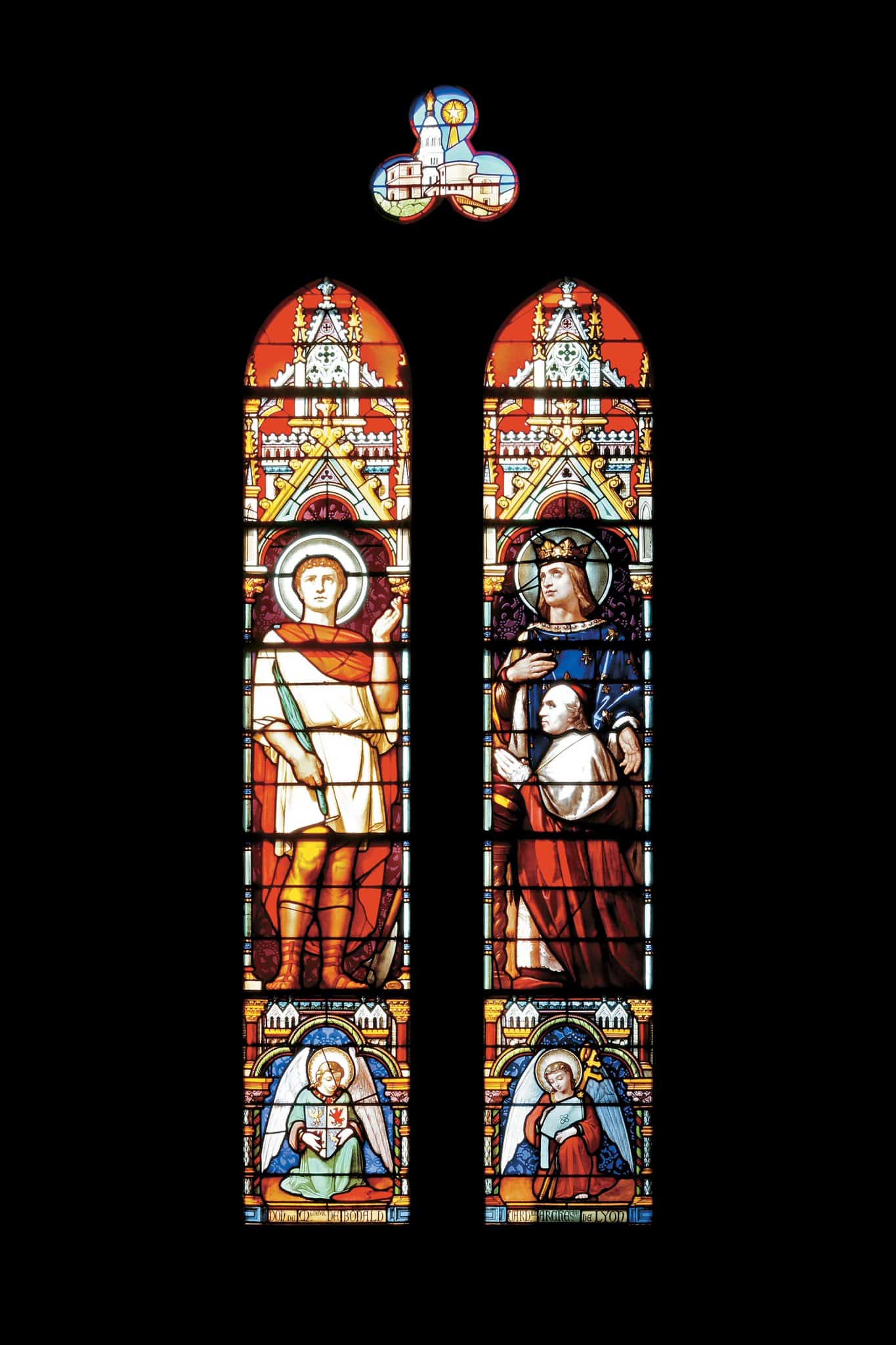 Au sommet, dans un trilobe, Notre-Dame de Fourvières à Lyon. Sur la lancette de gauche, saint Maurice tient la palme du martyre. En-dessous, un ange tient les armes du chapitre de Lyon. Sur la lancette de droite, saint Louis présente l’archevêque de Bonald, primat des Gaules, à saint Maurice. En-dessous, un ange tient la mitre et la croix du prélat.