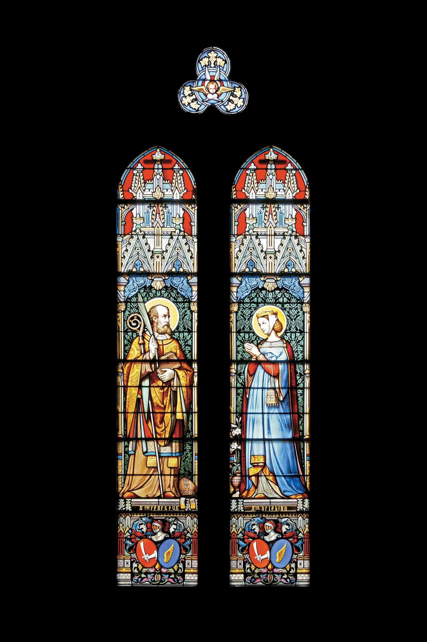 Stus ernestus (lancette de gauche cartouche sous le saint) // Sta delphina (lancette de droite cartouche sous la sainte)