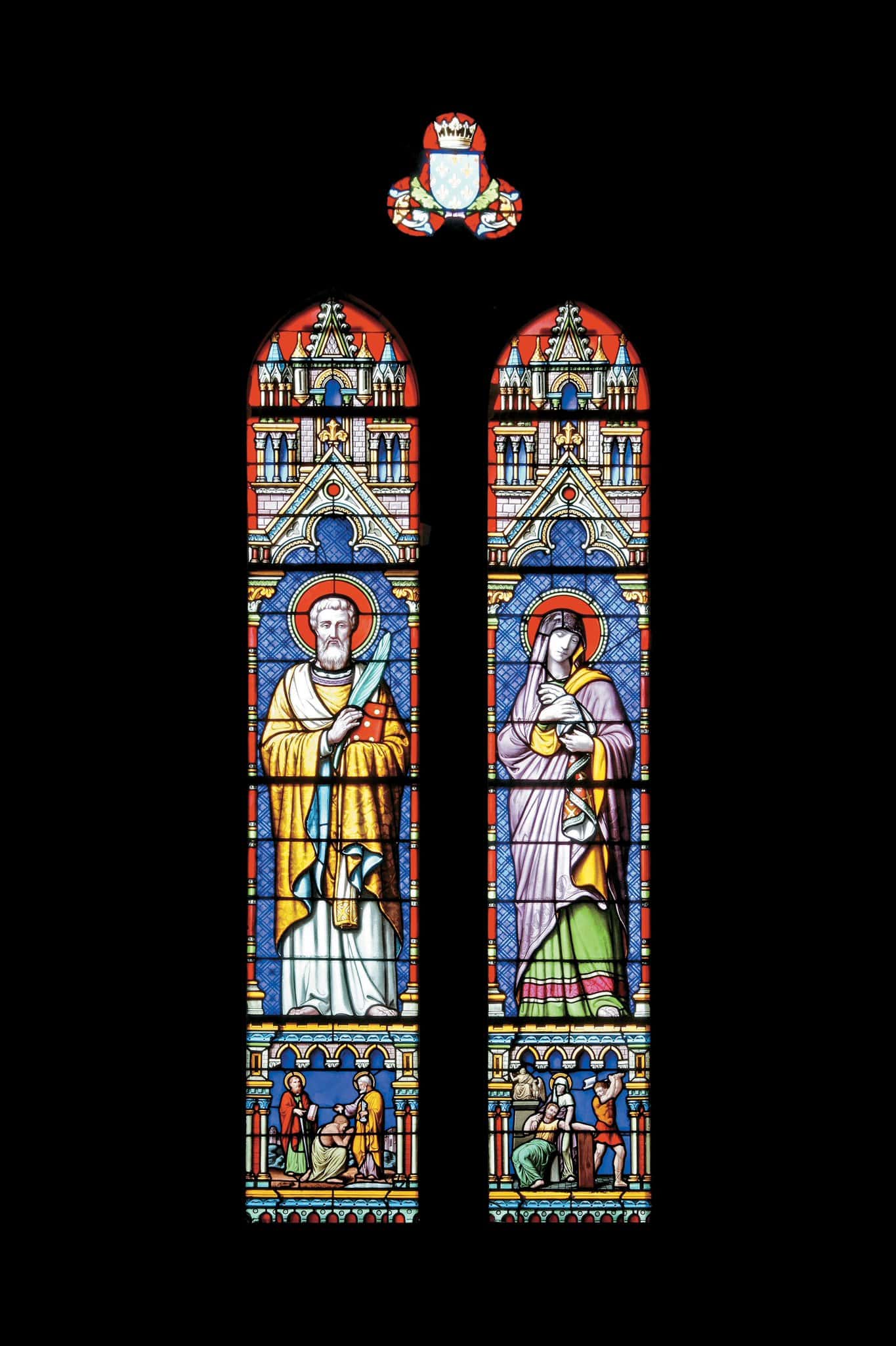 Au sommet, les armoiries des rois de France. Sur la lancette de gauche, saint Adrien tient la palme du martyre. Son bras gauche est coupé. En-dessous, le baptême du saint avec la présence symbolique de saint Pierre et saint Paul. Sur la lancette de droite, sainte Nathalie tient le bras coupé de son époux. En-dessous, la scène de l’amputation