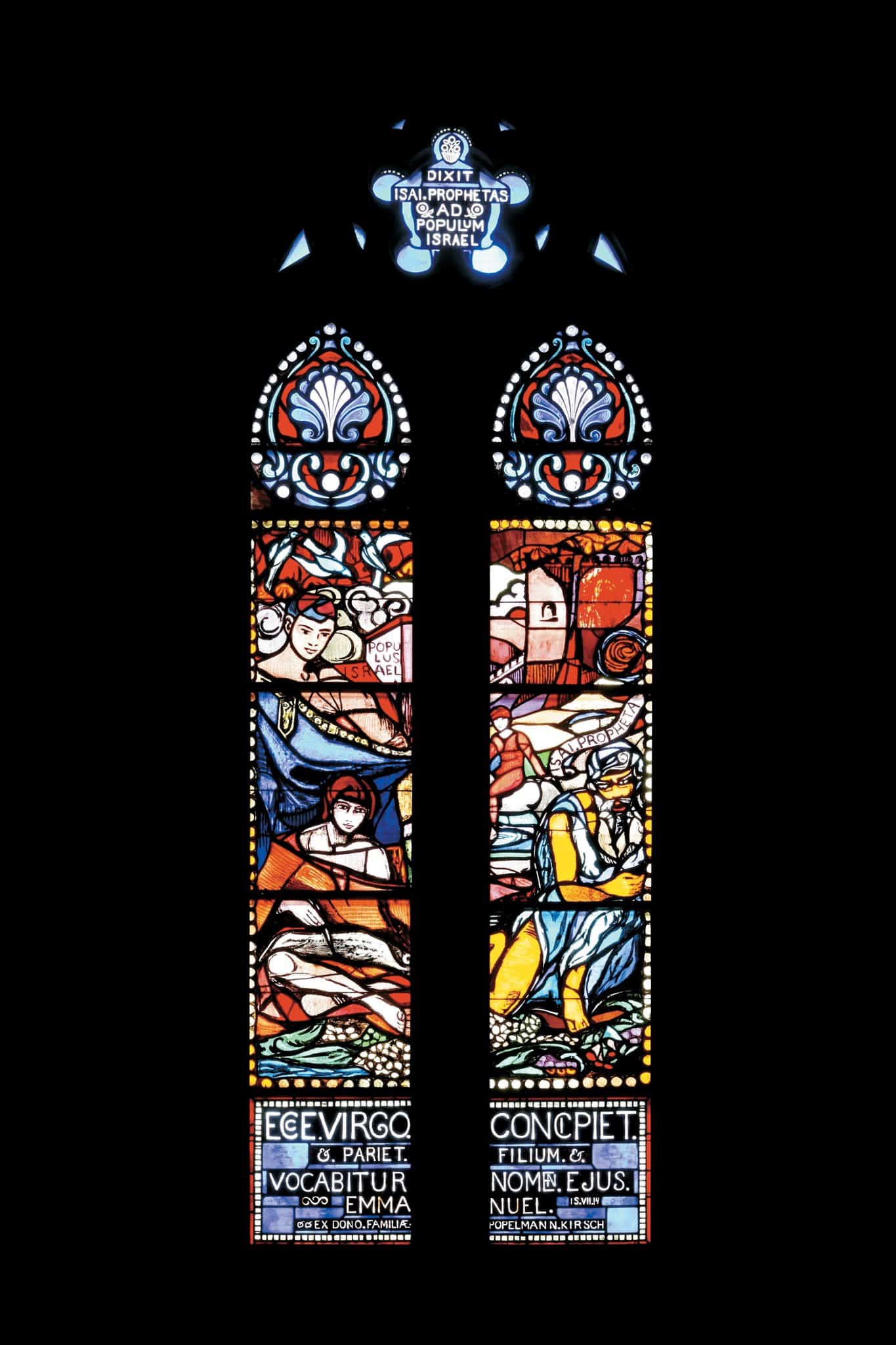 DIXIT / ISAI PROPHETAS / AD / POPU / LUS / ISRAEL (rosace) // POPU/ LUS / AEL (lancette de gauche) // ISAI PROPHETA (lancette de droite, phylactère) // ECCE VIRGO // CONCIPIET / & PARIET // FILIUM & / VOCABITUR // NOMEN EJUS / EMMA //NUEL / Sc. VII.14/ EX DONO FAMILIAE // POPELMANN KIRSCH (donateur) (sous la scène, texte continu d’une lancette à l’autre)