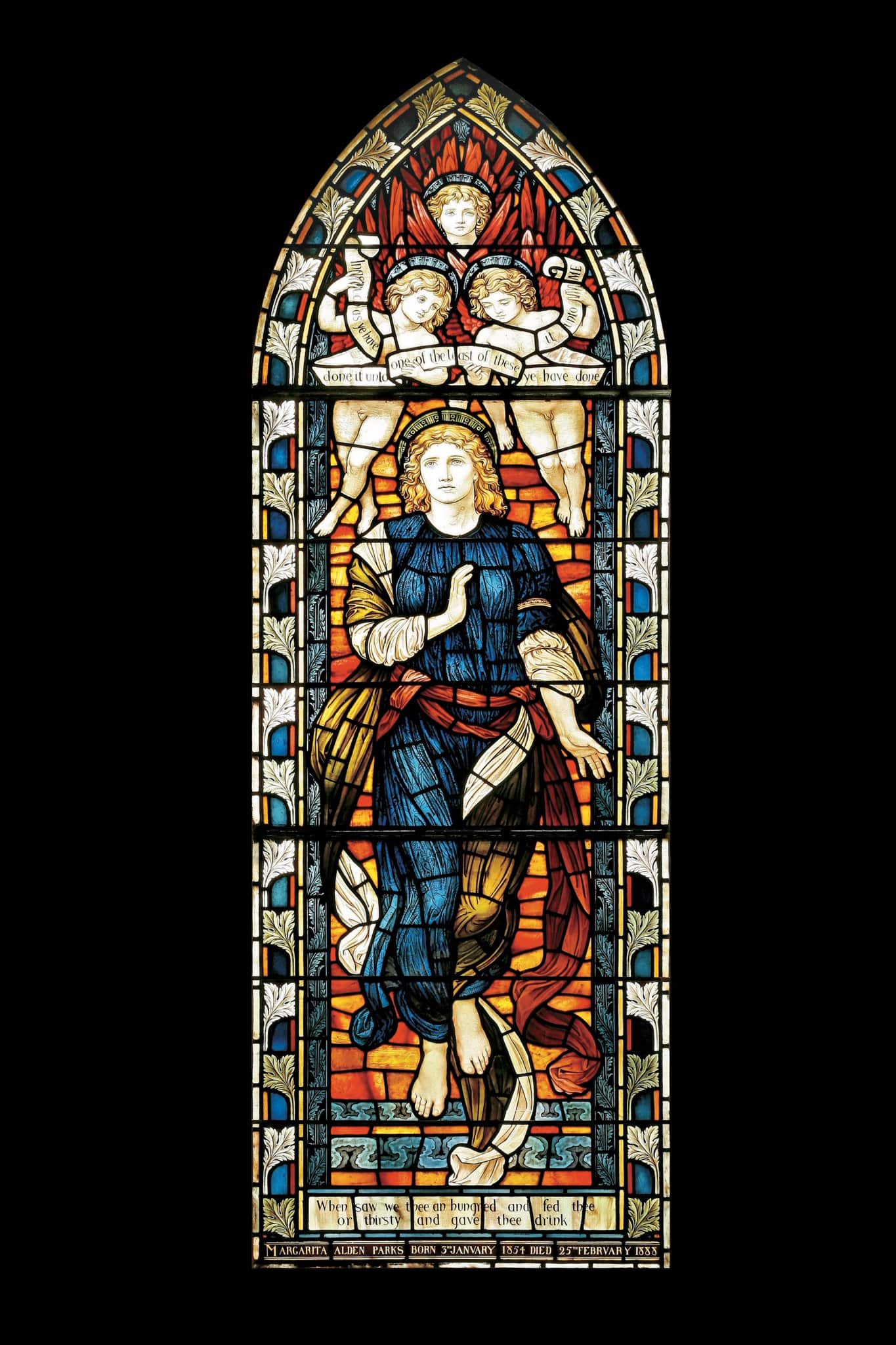 In as much as ye have / it unto ME / done it unto one of the least of these ye have done (banderole en-dessus de la sainte) / When saw we Thee an hungred and fed Thee or thirsty and gave Thee drink (sous le Christ) / MARGARITA ALDEN PARKS BORN 3RD JANUARY 1854 DIED 25TH FEBRUARY 1888 (bandeau en bas)