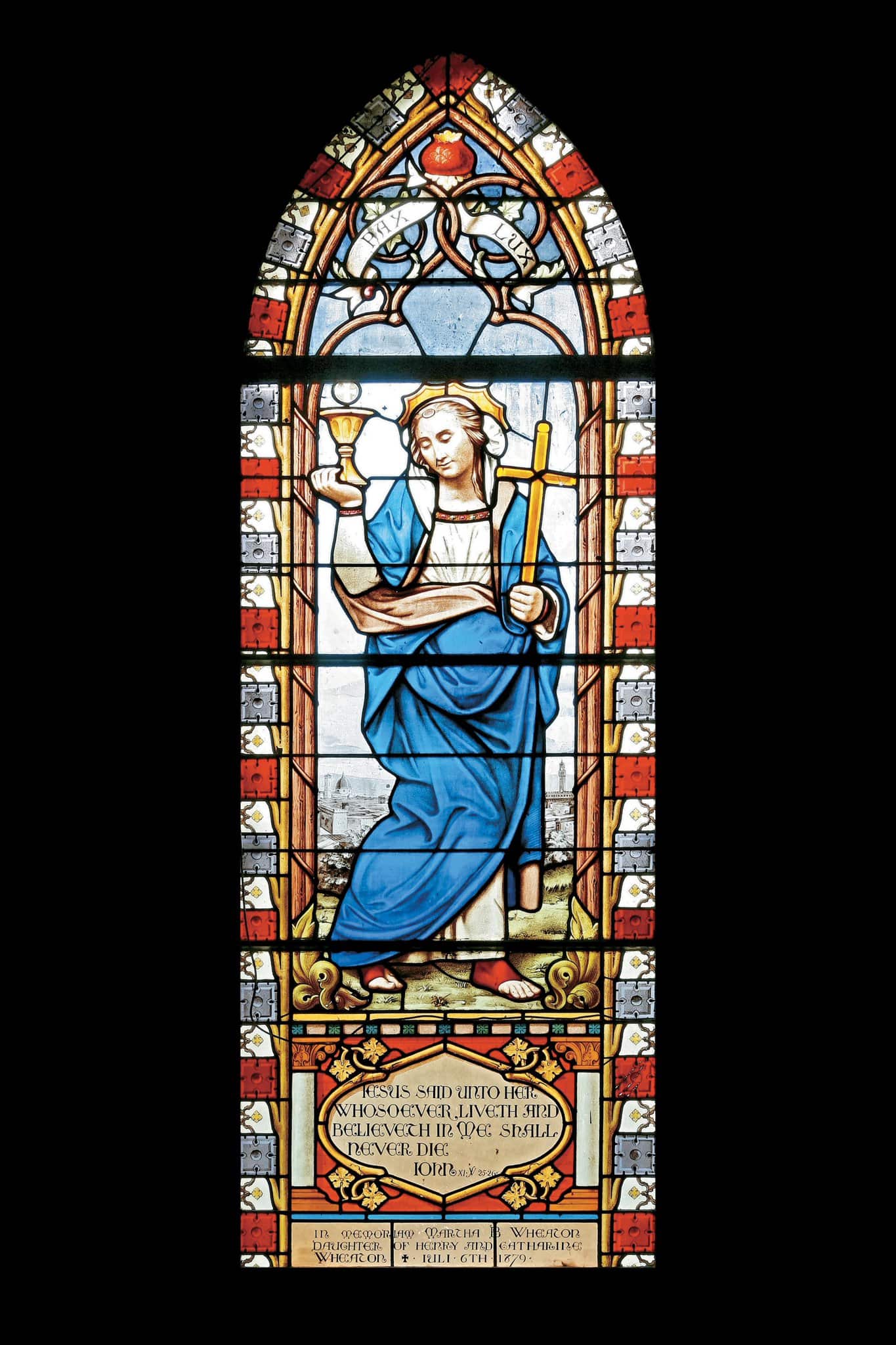 PAX / LUX (banderoles en haut) / JESUS SAID UNTO HER / WHOSOEVER LIVETH AND / BELIEVETH IN ME SHALL / NEVER DIE / IOHN XI.V.25 -26 (sous la sainte) / IN MEMORIAM MARTHA B. WHEATON / DAUGHTER OF HENRY AND CATHARINE / WHEATON † IULI 6TH 1879 (bandeau en bas)