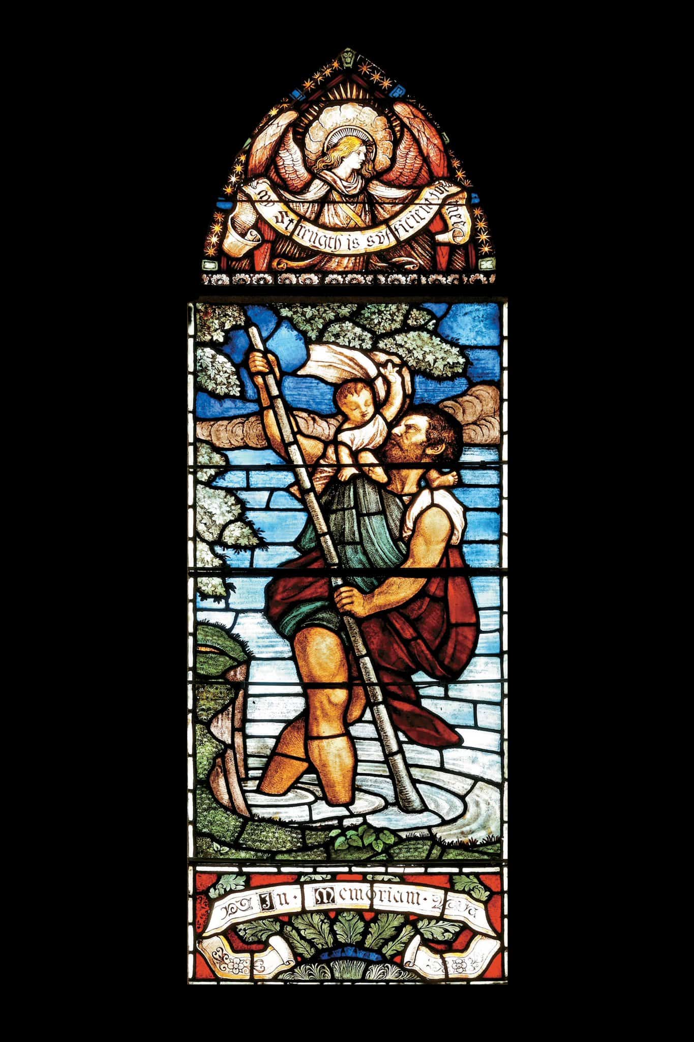 Saint Christophe porte un enfant sur ses épaules pour l’aider à traverser un cours d’eau dangereux. Arrivé de l’autre côté, l’enfant lui dit qu’il est le Christ.