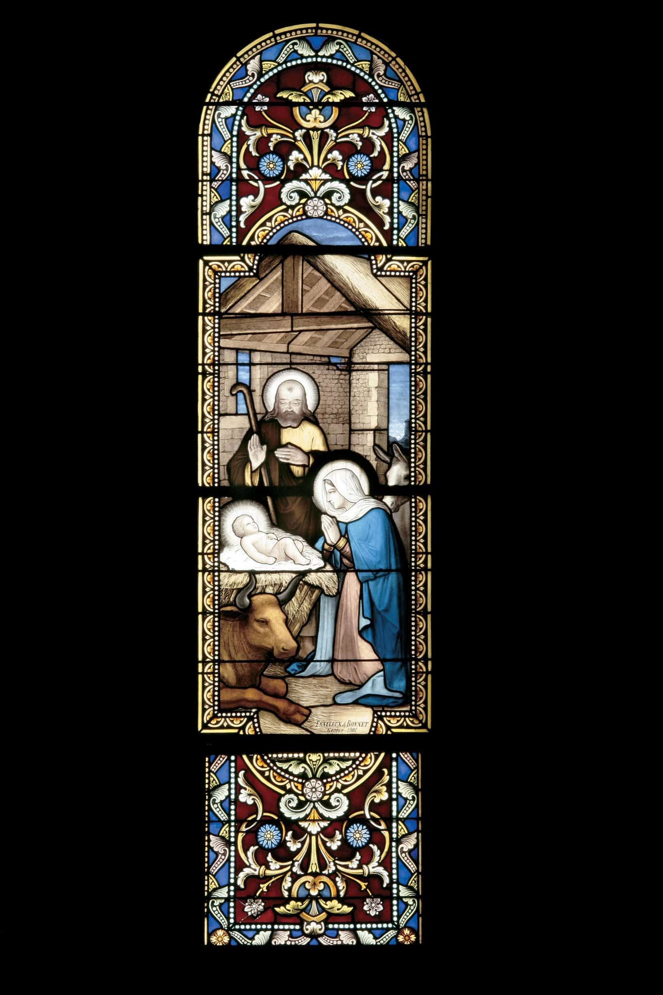 Marie, agenouillée, est en prière devant l’Enfant Jésus, alors que Joseph, debout, fait un signe de bénédiction. Le boeuf est couché devant la mangeoire.