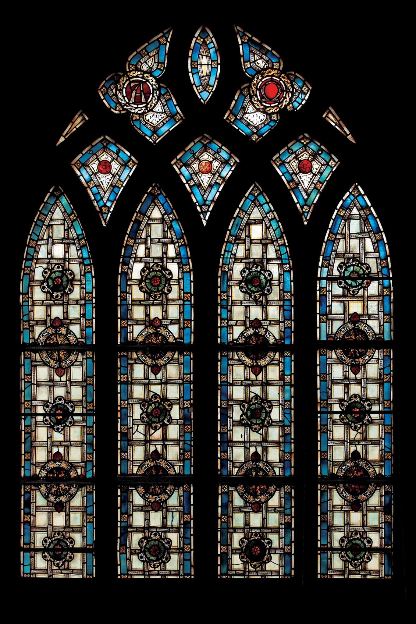 Au sommet, on trouve deux médaillons avec l’alpha et l’oméga. Sur chacune des quatre lancettes figurent des médaillons.